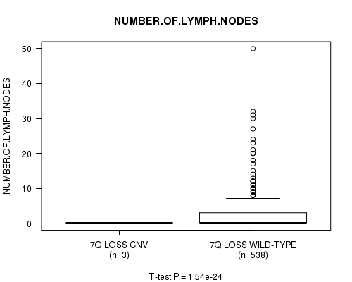 Figure S16. Get High-res Image Gene #53: '7q loss' versus Clinical Feature #10: 'NUMBER.OF.LYMPH.NODES'