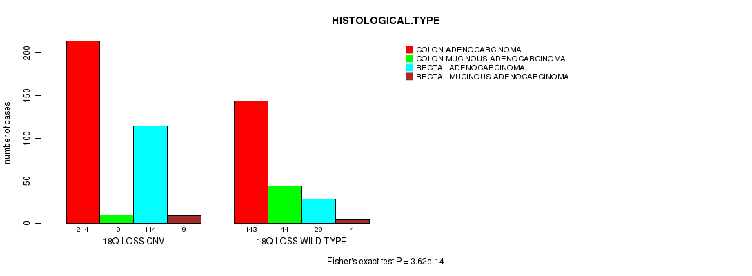 18q loss cnv correlated to 'PRIMARY.SITE.OF.DISEASE' and 'HISTOLOGICAL.TYPE'.