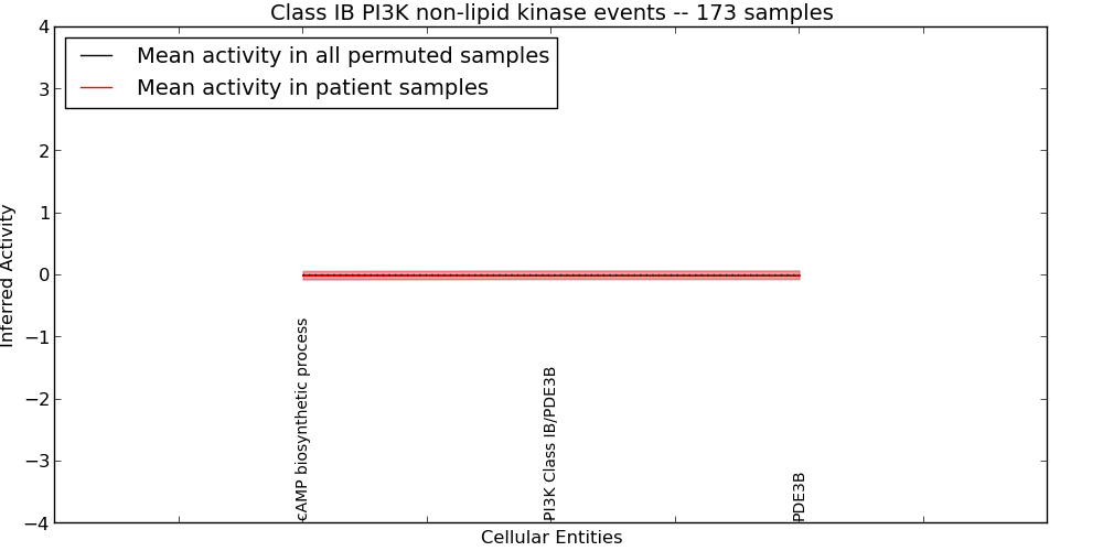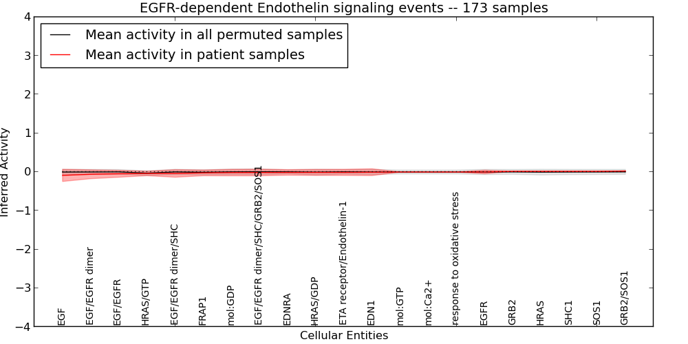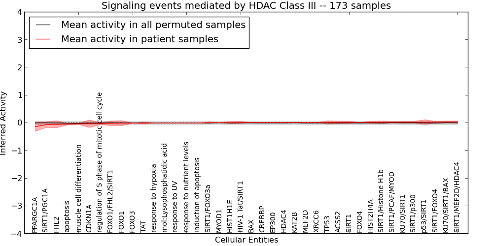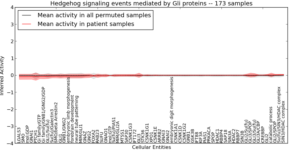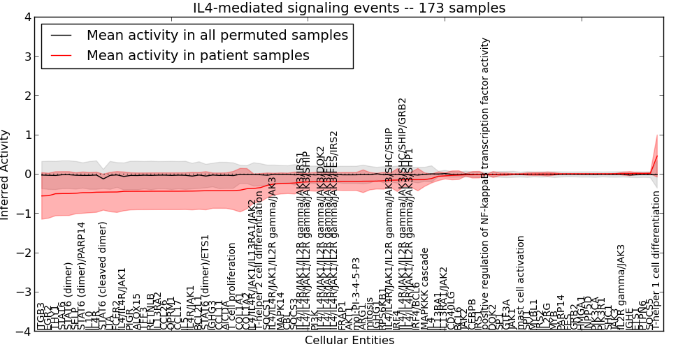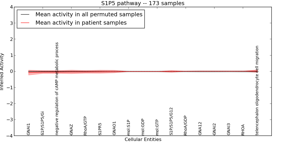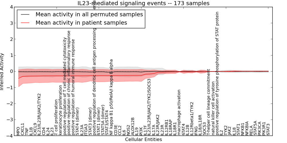 Figure S131.  Get High-res Image This plot shows pathway concept perturbations across all samples against a permutation model. The concepts along the x-axis are sorted by lowest to highest mean activity for the real patient samples. Mean inferred activities are plotted along the y-axis as a colored band showing the average level and one standard deviation range. Real samples are shown in red and permuted samples in black.