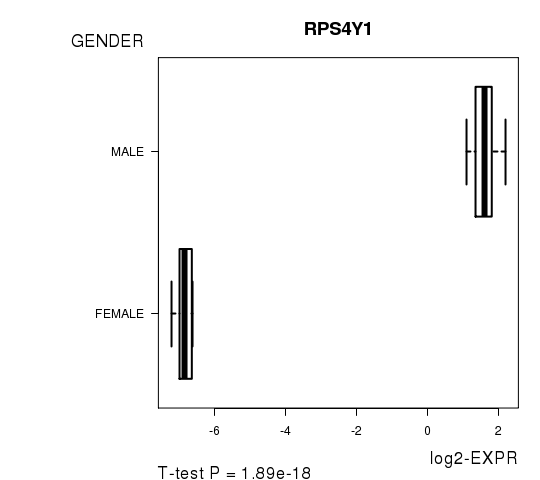 Figure S1. Get High-res Image As an example, this figure shows the association of RPS4Y1 to 'GENDER'. P value = 1.89e-18 with T-test analysis.