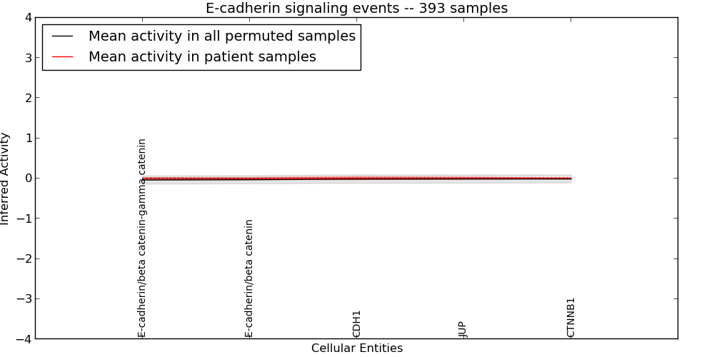The significance of the IPL obtained for each concept in each patient sample is assessed using a permutation analysis. Importantly, the permutation analysis preserves data tuples so as to preserve any implicit correlations between the different data modalities. For example, genes that are deleted have concomitantly lower expression levels. Preserving the copy number and expression pairs therefore retains this data property. The simulation therefore makes "null samples" by permuting data tuples across all of the genes in the genome so that each gene in a null sample is associated with a random tuple of another gene with equal probability. This approach has the added benefit of preserving the pathway structure so that every observed IPL can be compared to a distribution of random IPLs derived from exactly the same interaction context. PARADIGM inferences are then obtained for 1000 "null" patients and serve as a background distribution to contrast the observed IPLs against. Pathway concepts are excluded from further analysis if they did not obtain a minimum IPL of 0.5 in any patient sample both observed or simulated.