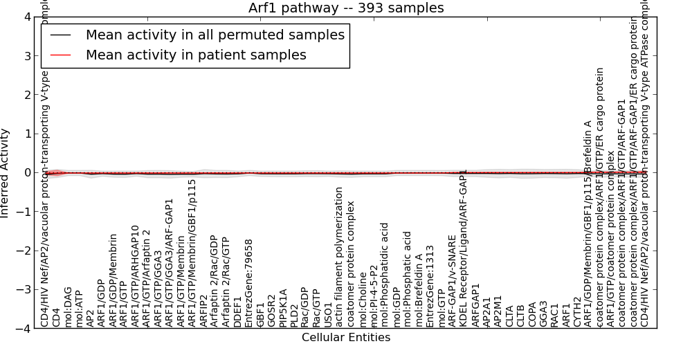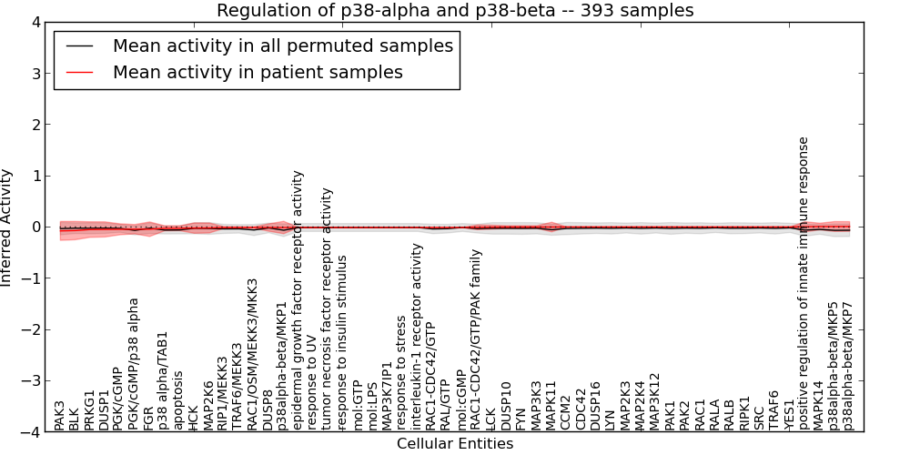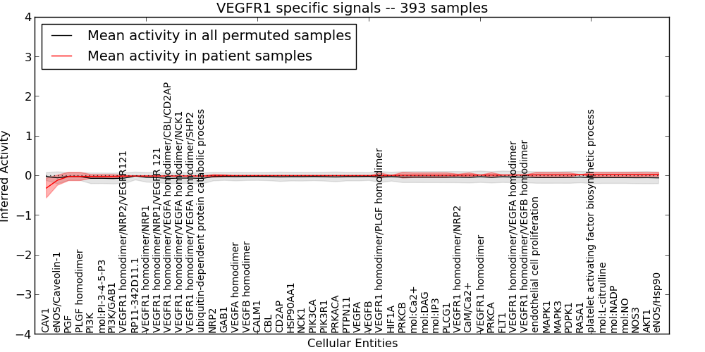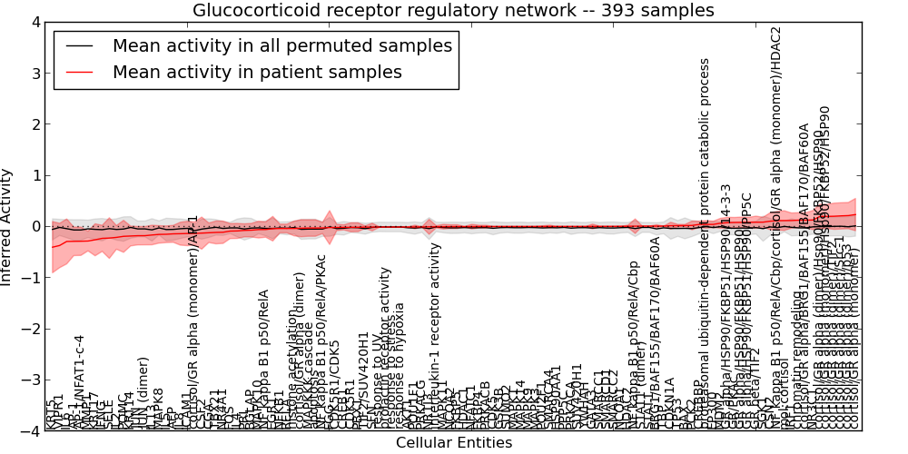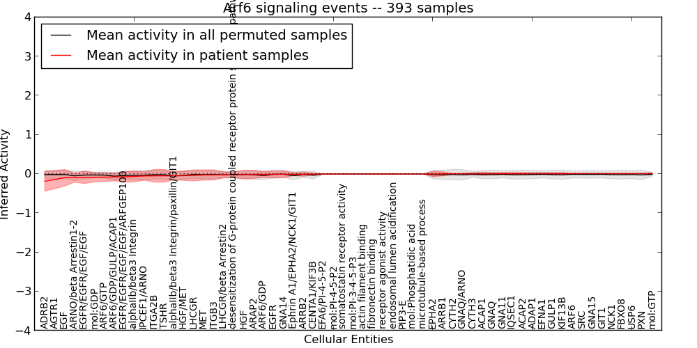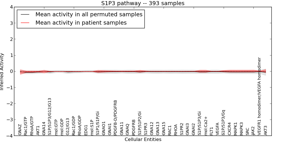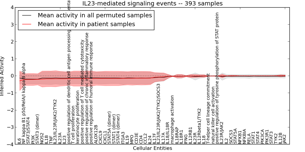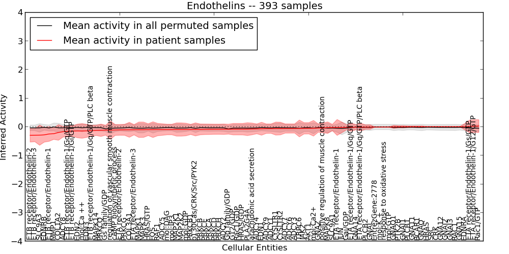 Figure S131.  Get High-res Image This plot shows pathway concept perturbations across all samples against a permutation model. The concepts along the x-axis are sorted by lowest to highest mean activity for the real patient samples. Mean inferred activities are plotted along the y-axis as a colored band showing the average level and one standard deviation range. Real samples are shown in red and permuted samples in black.