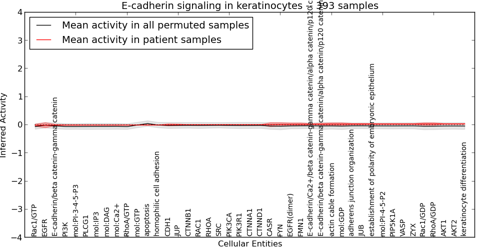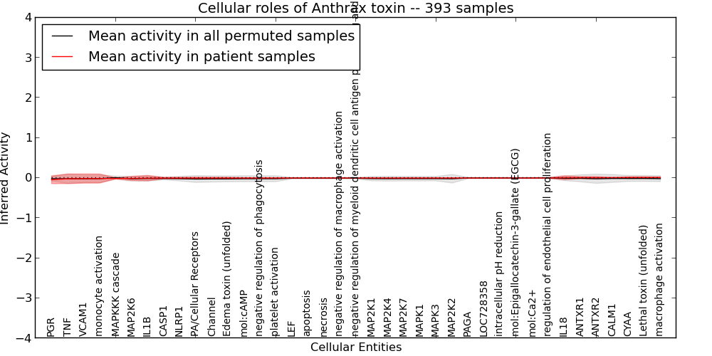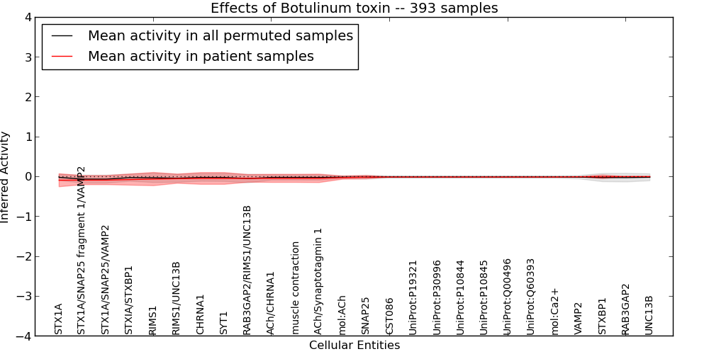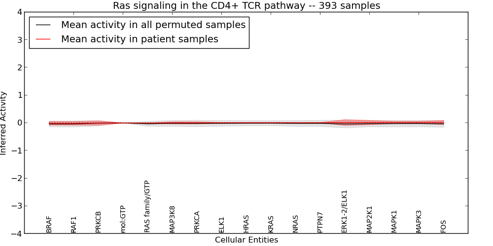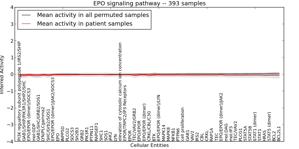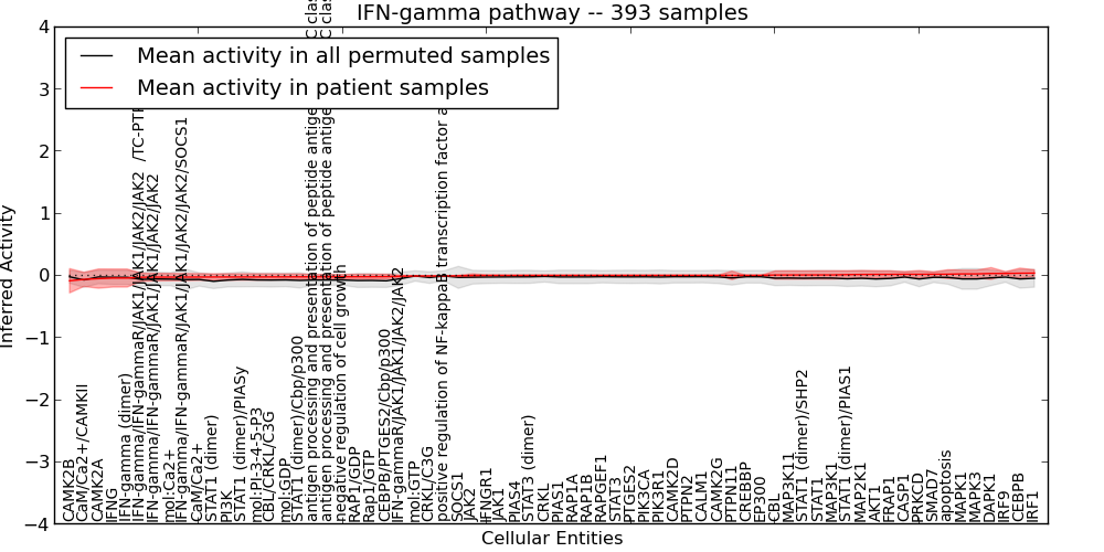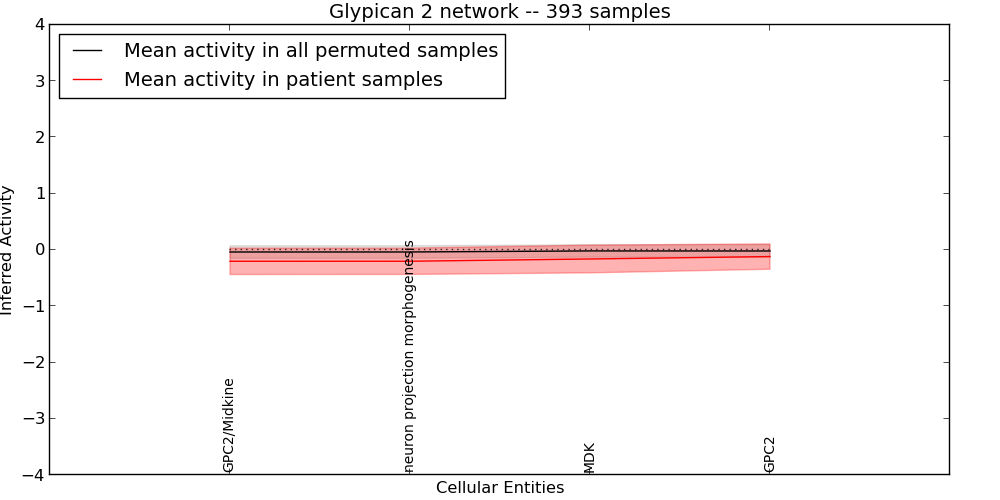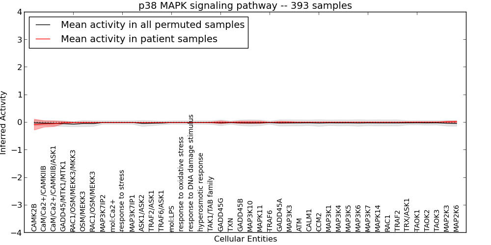 Figure S131.  Get High-res Image This plot shows pathway concept perturbations across all samples against a permutation model. The concepts along the x-axis are sorted by lowest to highest mean activity for the real patient samples. Mean inferred activities are plotted along the y-axis as a colored band showing the average level and one standard deviation range. Real samples are shown in red and permuted samples in black.