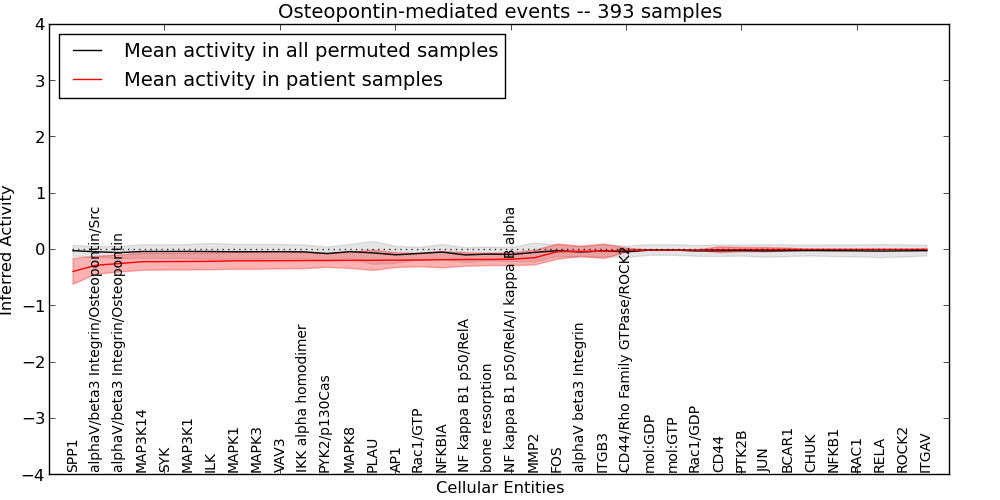 Figure S130.  Get High-res Image This plot shows pathway concept perturbations across all samples against a permutation model. The concepts along the x-axis are sorted by lowest to highest mean activity for the real patient samples. Mean inferred activities are plotted along the y-axis as a colored band showing the average level and one standard deviation range. Real samples are shown in red and permuted samples in black.