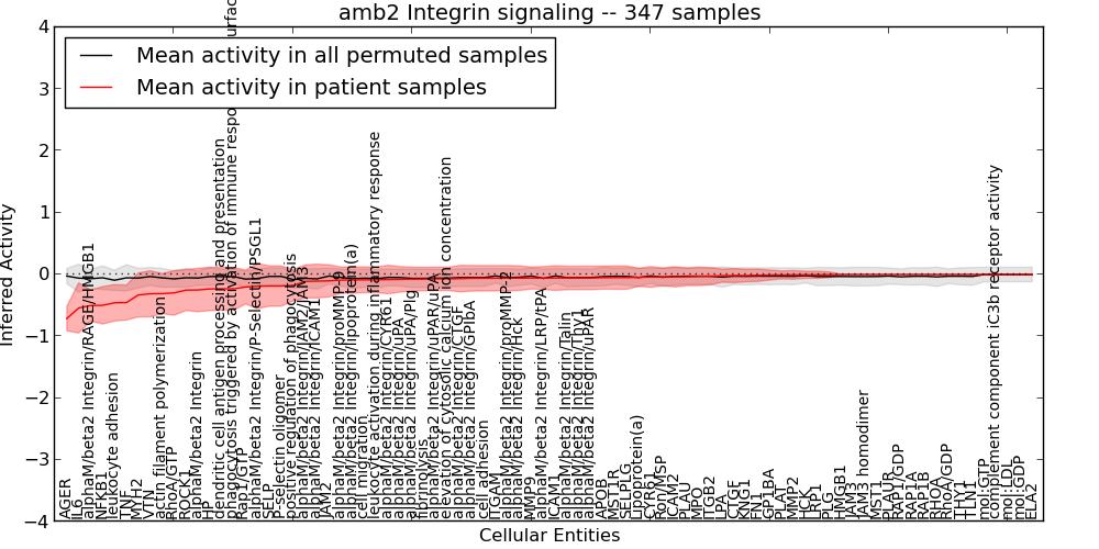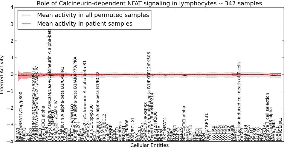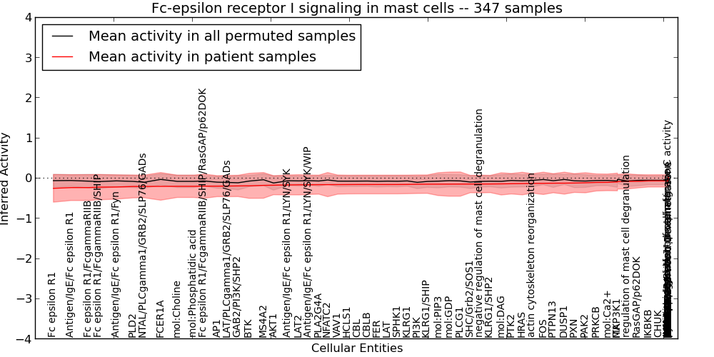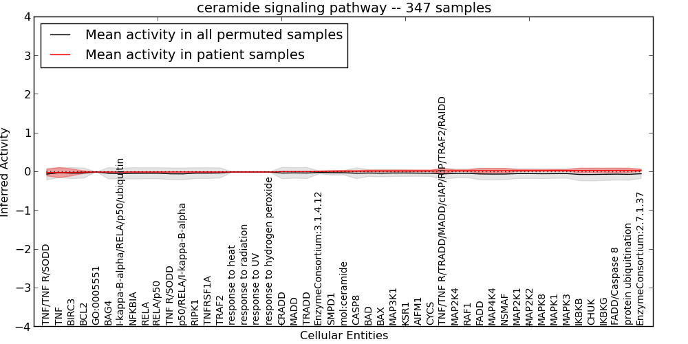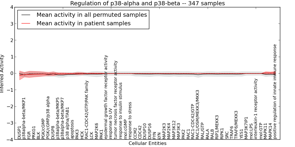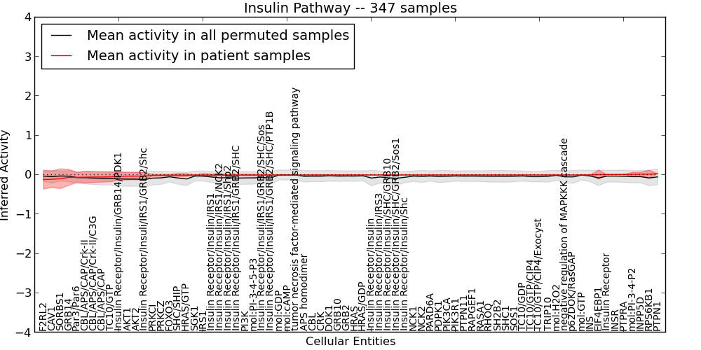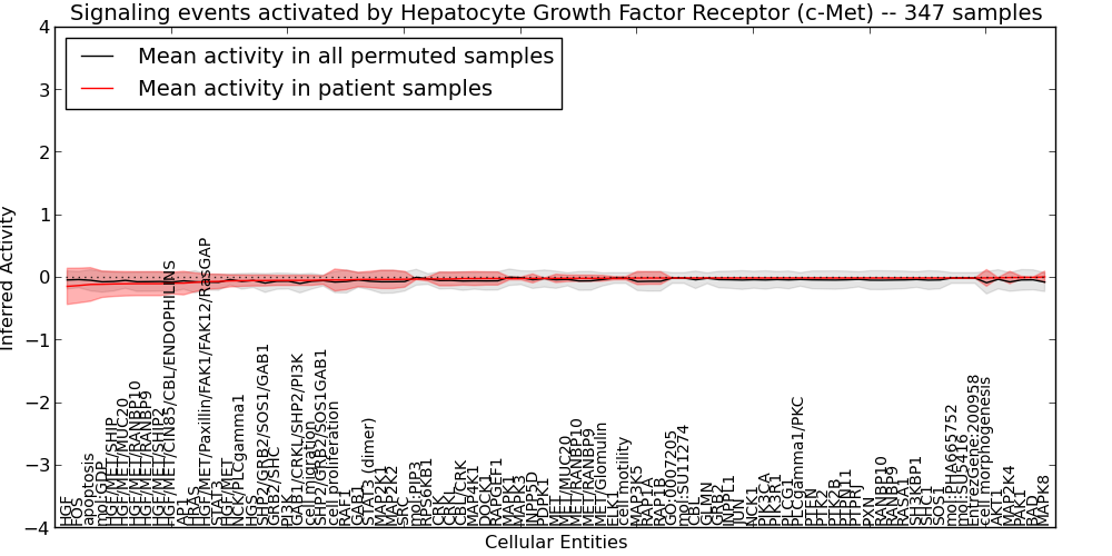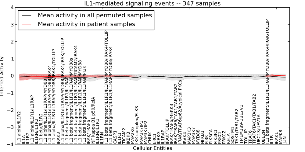 Figure S131.  Get High-res Image This plot shows pathway concept perturbations across all samples against a permutation model. The concepts along the x-axis are sorted by lowest to highest mean activity for the real patient samples. Mean inferred activities are plotted along the y-axis as a colored band showing the average level and one standard deviation range. Real samples are shown in red and permuted samples in black.