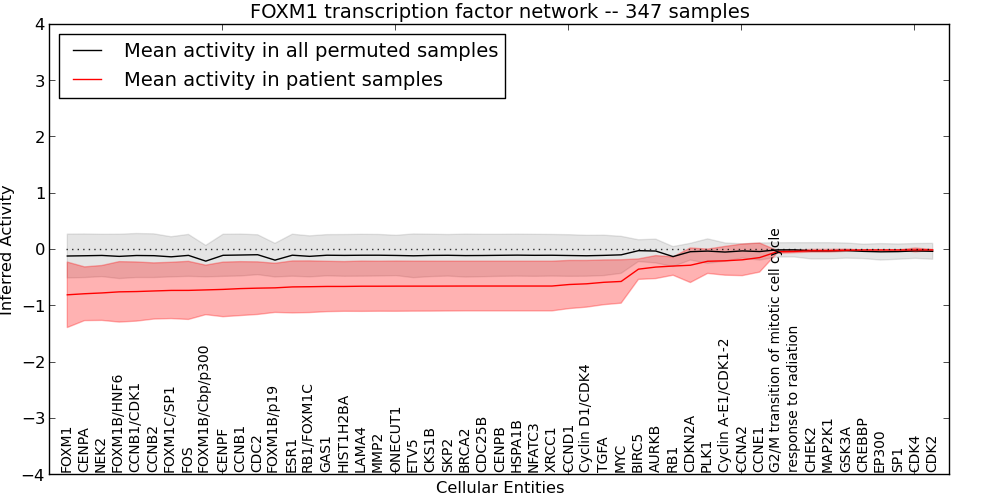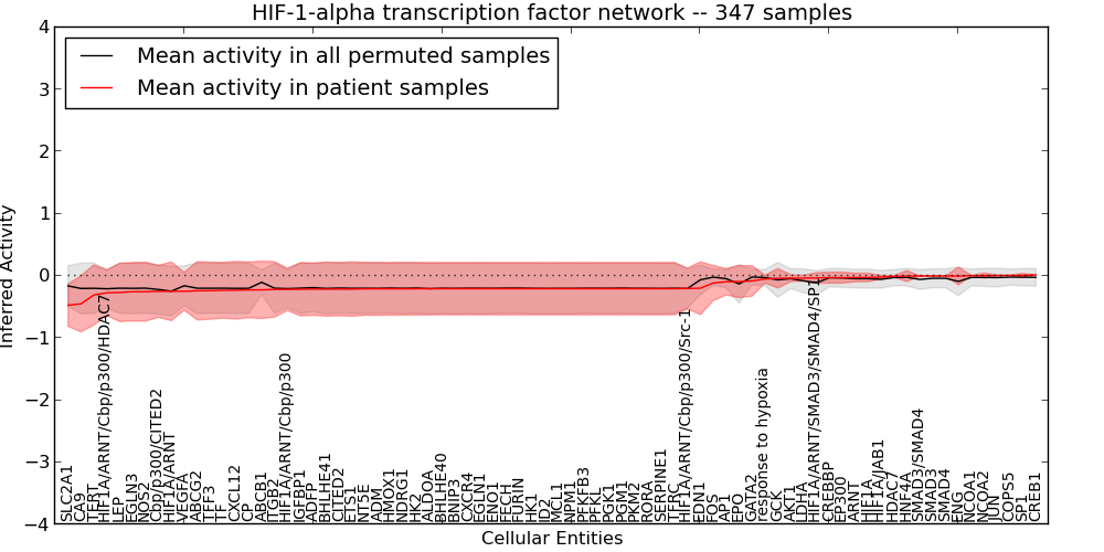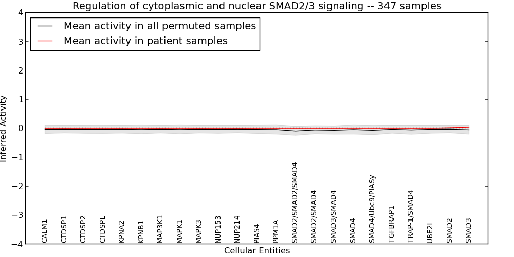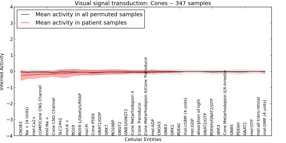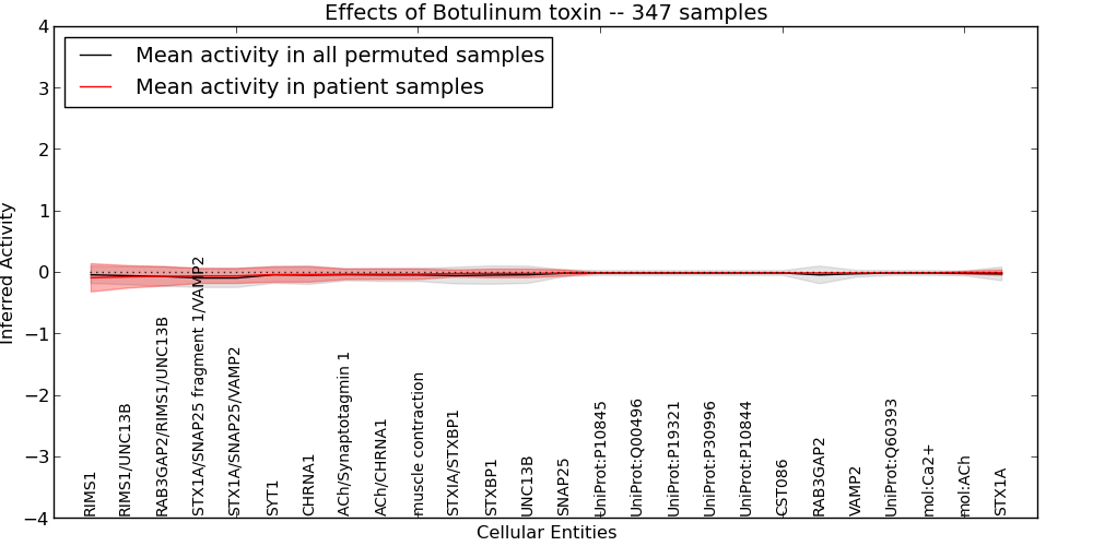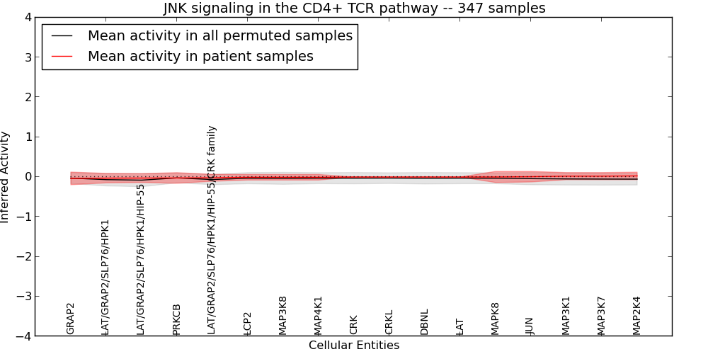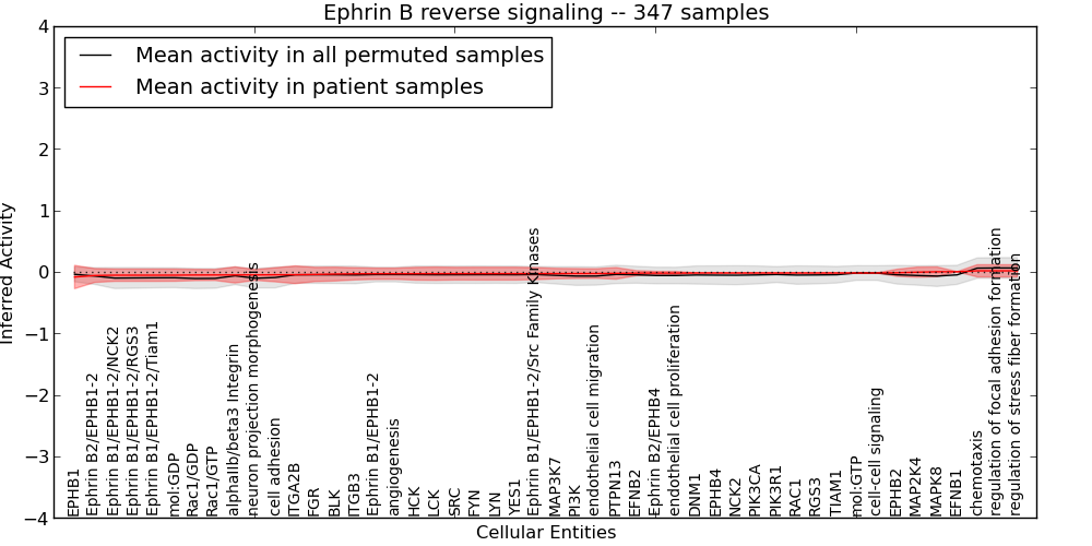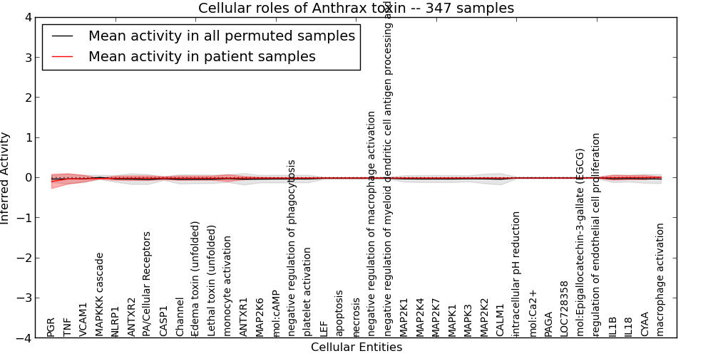 Figure S131.  Get High-res Image This plot shows pathway concept perturbations across all samples against a permutation model. The concepts along the x-axis are sorted by lowest to highest mean activity for the real patient samples. Mean inferred activities are plotted along the y-axis as a colored band showing the average level and one standard deviation range. Real samples are shown in red and permuted samples in black.