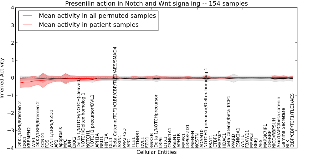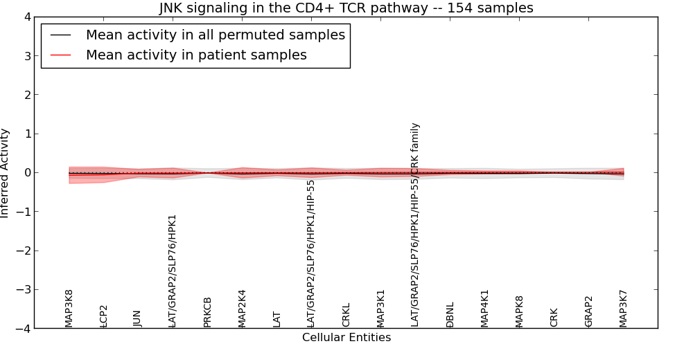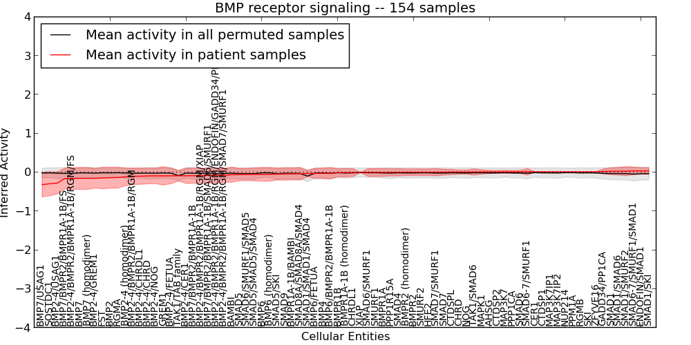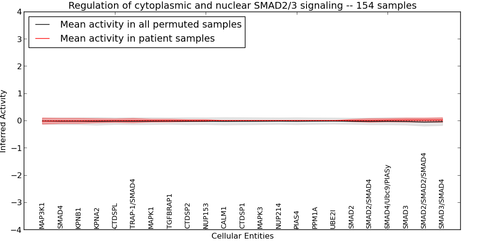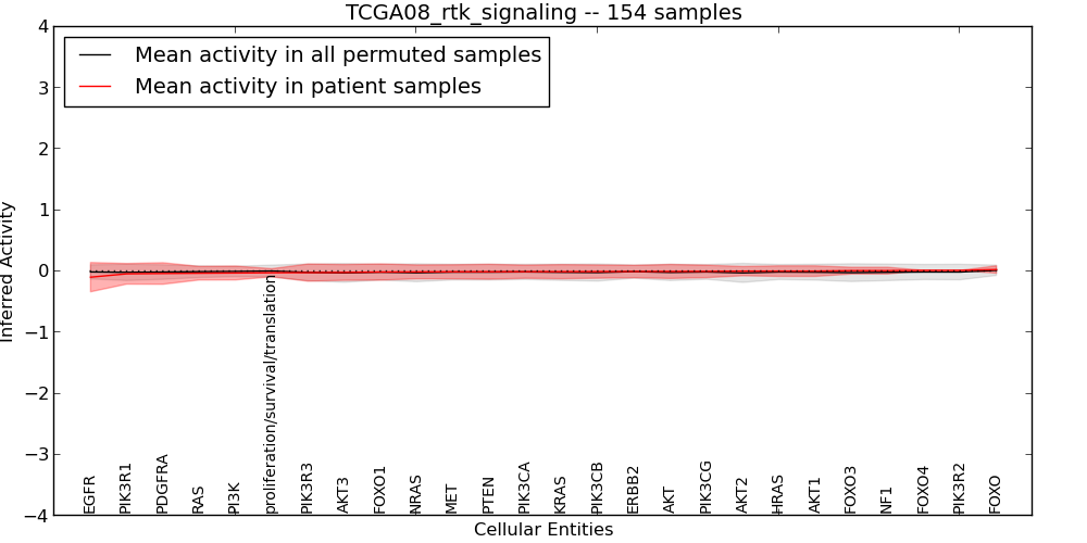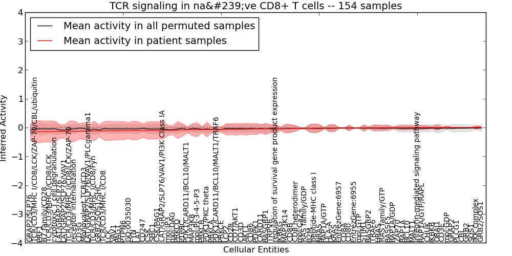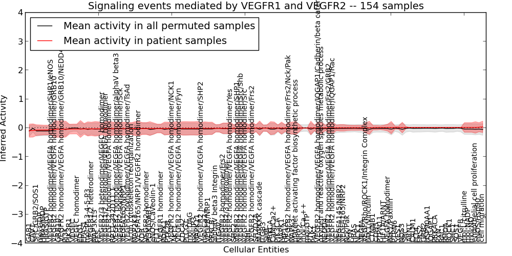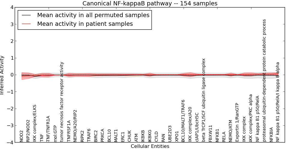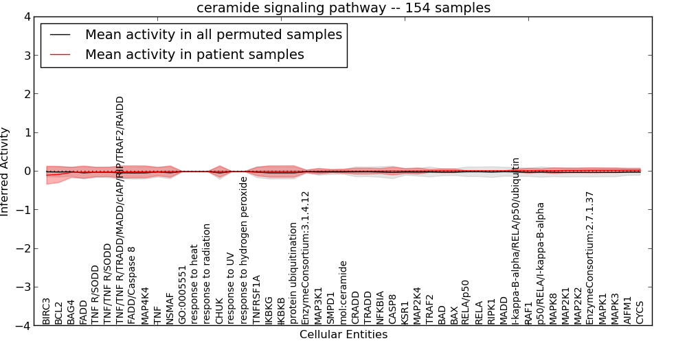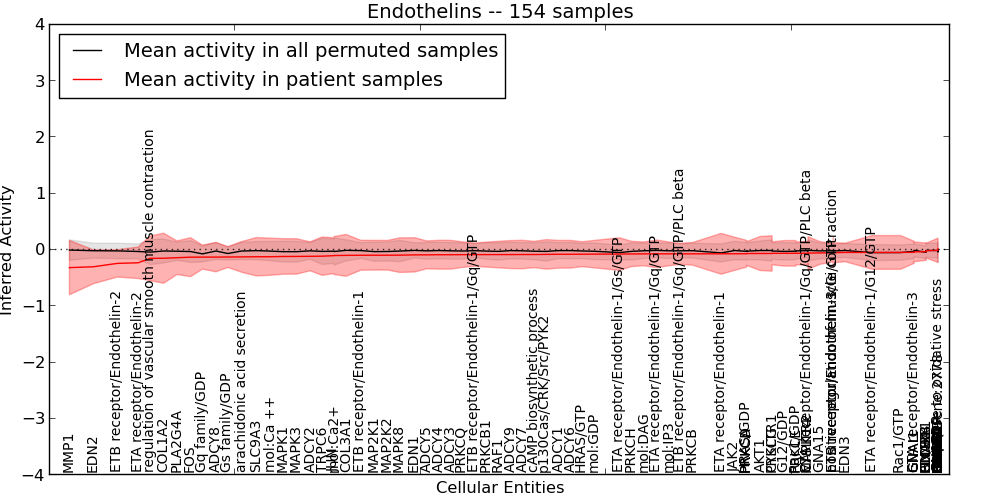 Figure S131. Get High-res Image This plot shows pathway concept perturbations across all samples against a permutation model. The concepts along the x-axis are sorted by lowest to highest mean activity for the real patient samples. Mean inferred activities are plotted along the y-axis as a colored band showing the average level and one standard deviation range. Real samples are shown in red and permuted samples in black.