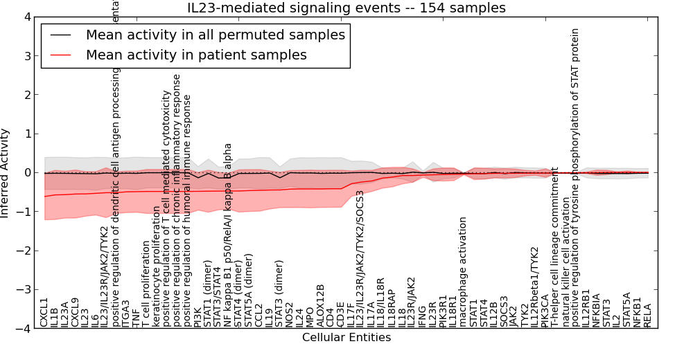 Figure S130. Get High-res Image This plot shows pathway concept perturbations across all samples against a permutation model. The concepts along the x-axis are sorted by lowest to highest mean activity for the real patient samples. Mean inferred activities are plotted along the y-axis as a colored band showing the average level and one standard deviation range. Real samples are shown in red and permuted samples in black.