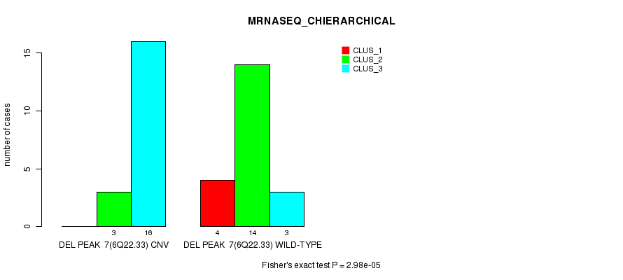 Del Peak 7(6q22.33) cnvs correlated to 'CN_CNMF', 'METHLYATION_CNMF', 'MRNASEQ_CNMF', 'MRNASEQ_CHIERARCHICAL', 'MIRSEQ_CNMF', 'MIRSEQ_CHIERARCHICAL', 'MIRSEQ_MATURE_CNMF', and 'MIRSEQ_MATURE_CHIERARCHICAL'.