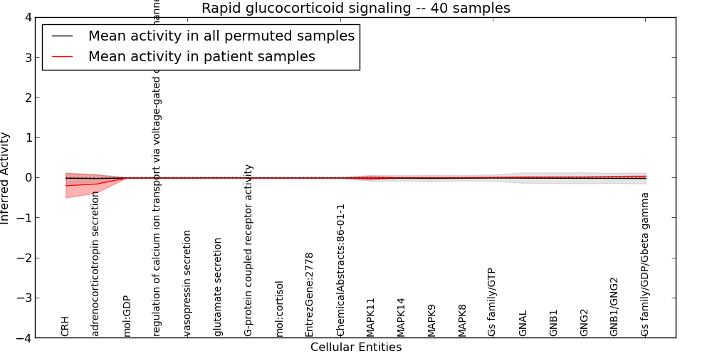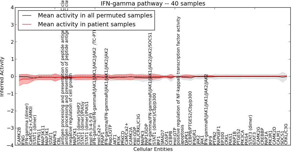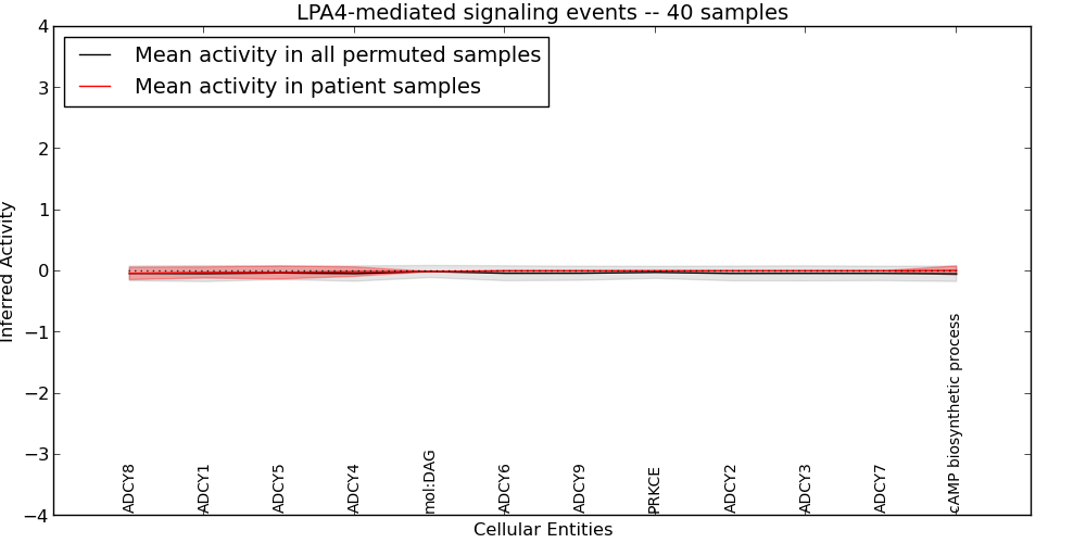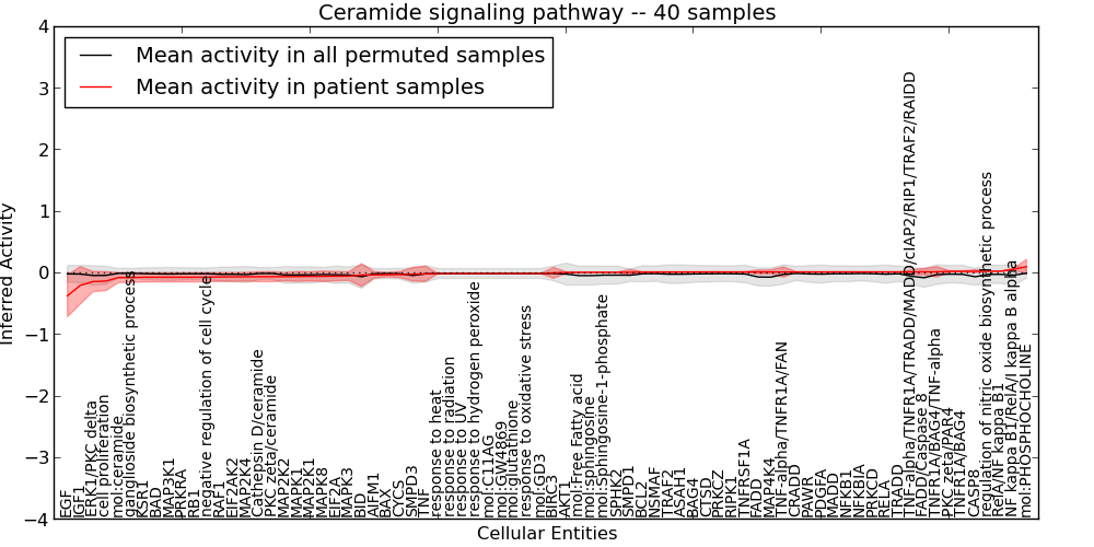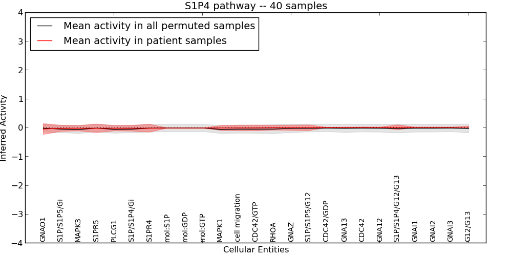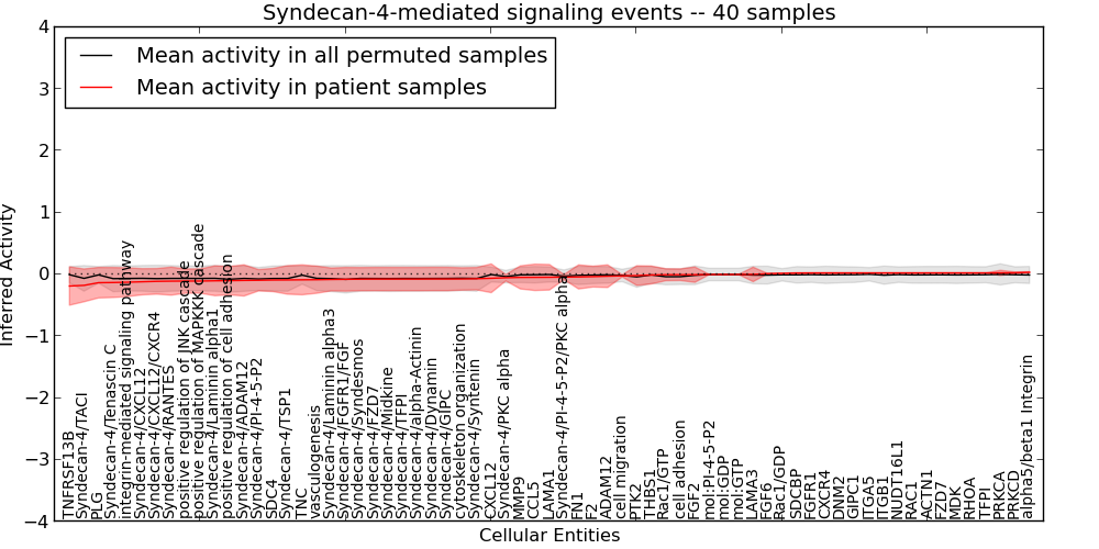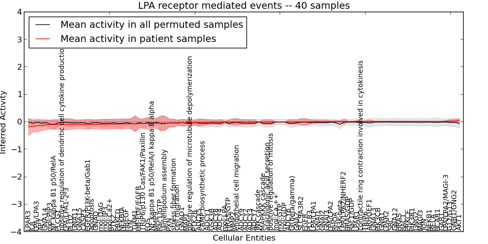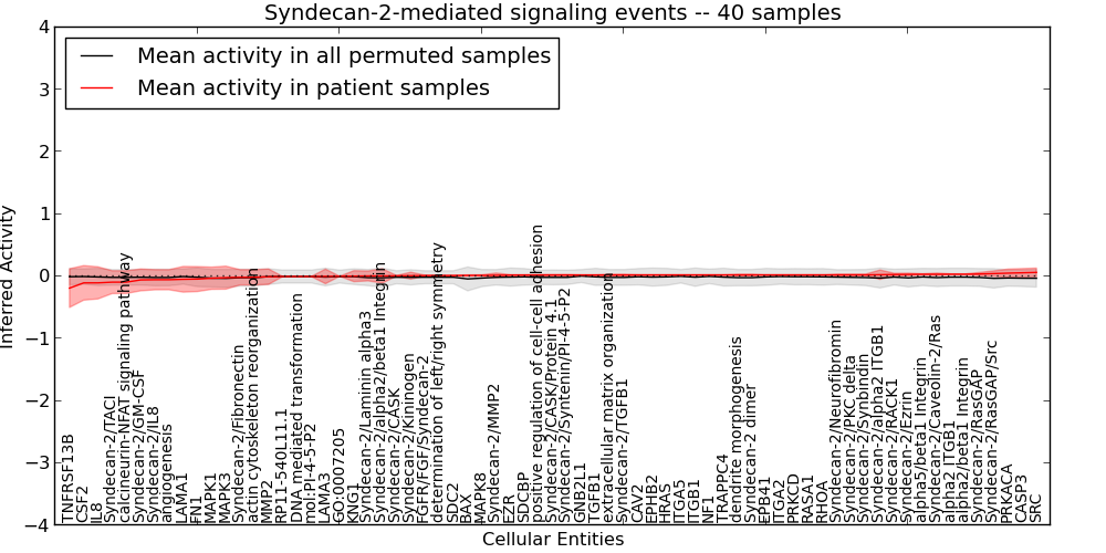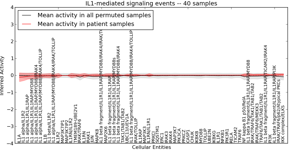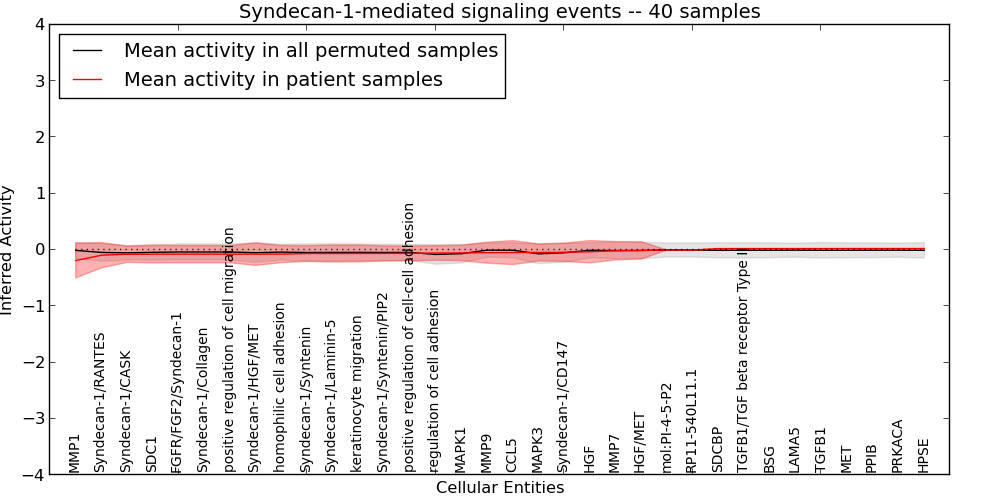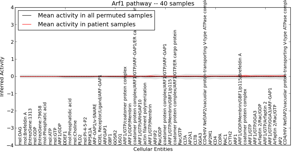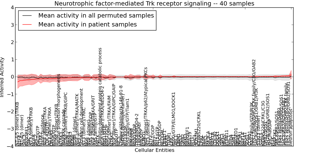 Figure S130. Get High-res Image This plot shows pathway concept perturbations across all samples against a permutation model. The concepts along the x-axis are sorted by lowest to highest mean activity for the real patient samples. Mean inferred activities are plotted along the y-axis as a colored band showing the average level and one standard deviation range. Real samples are shown in red and permuted samples in black.