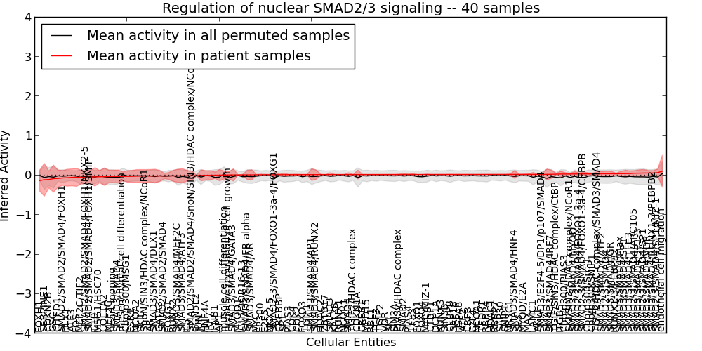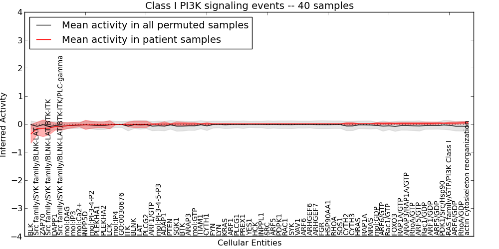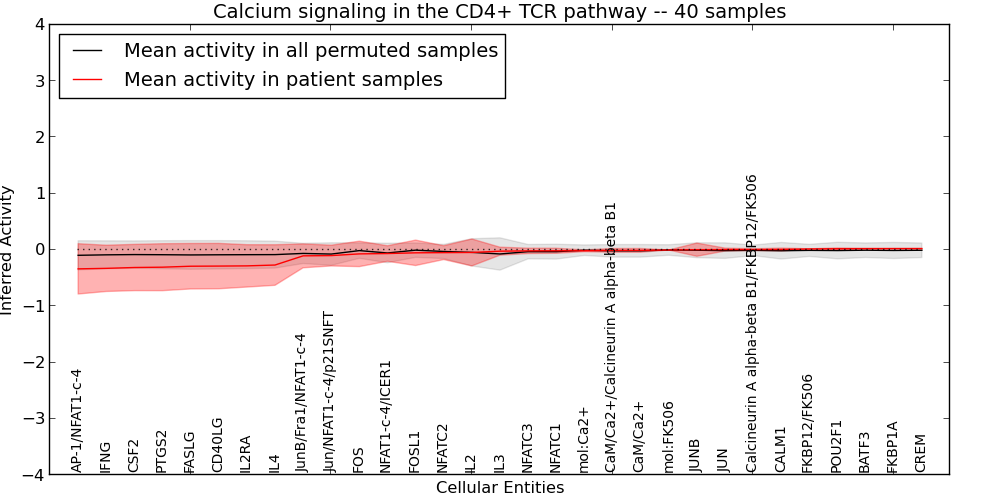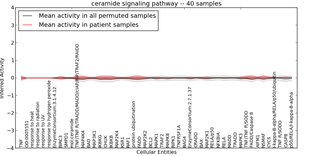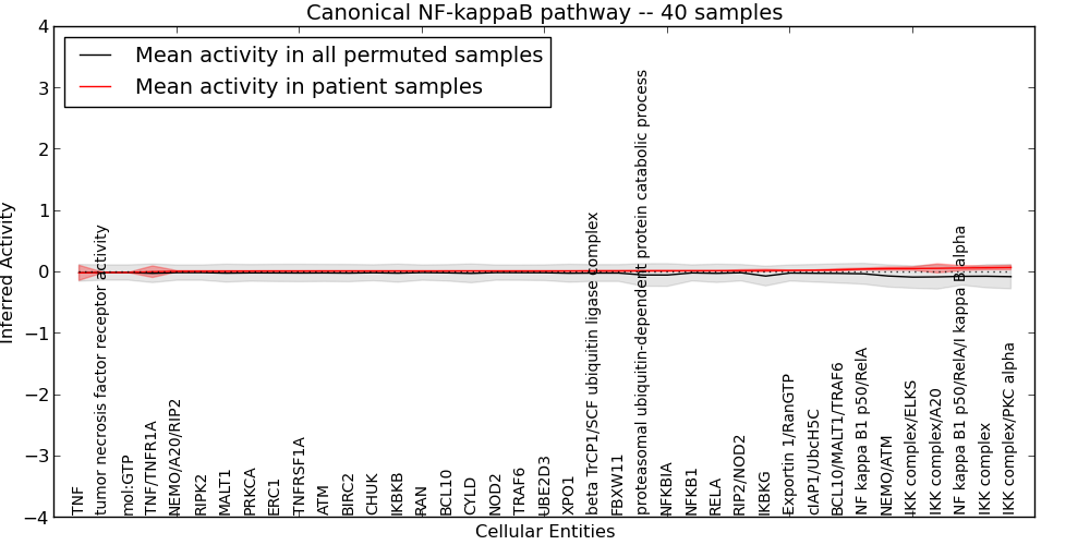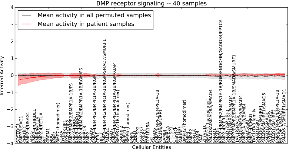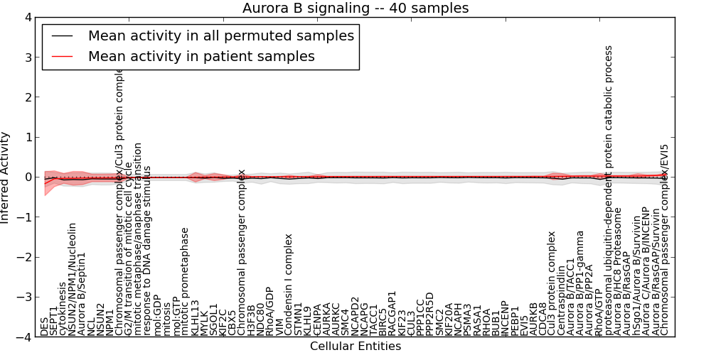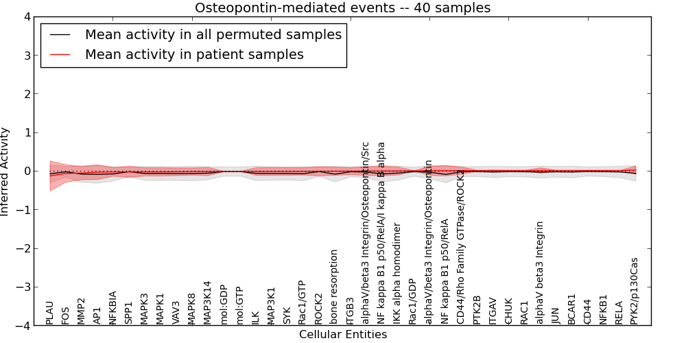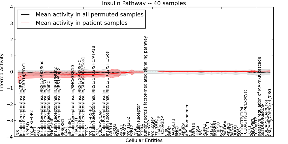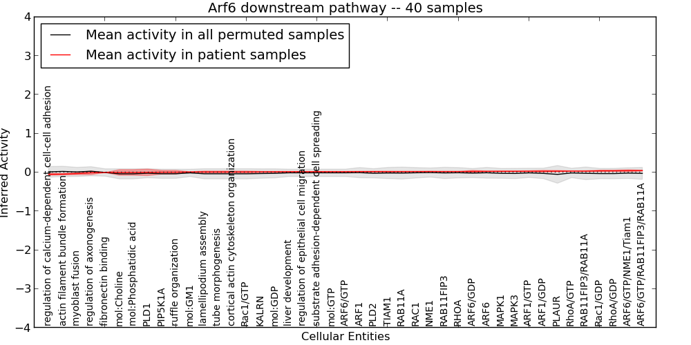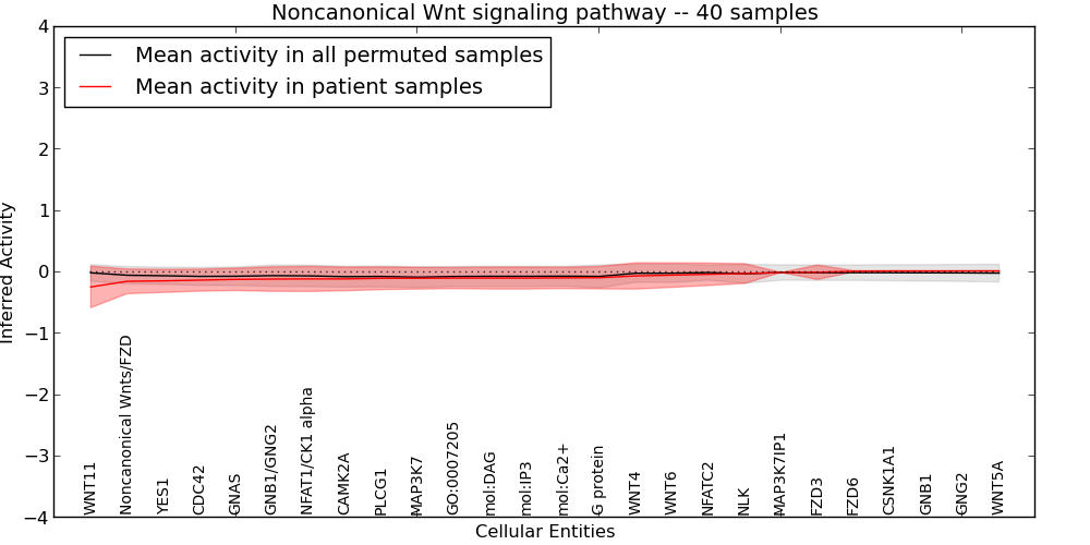 Figure S130. Get High-res Image This plot shows pathway concept perturbations across all samples against a permutation model. The concepts along the x-axis are sorted by lowest to highest mean activity for the real patient samples. Mean inferred activities are plotted along the y-axis as a colored band showing the average level and one standard deviation range. Real samples are shown in red and permuted samples in black.