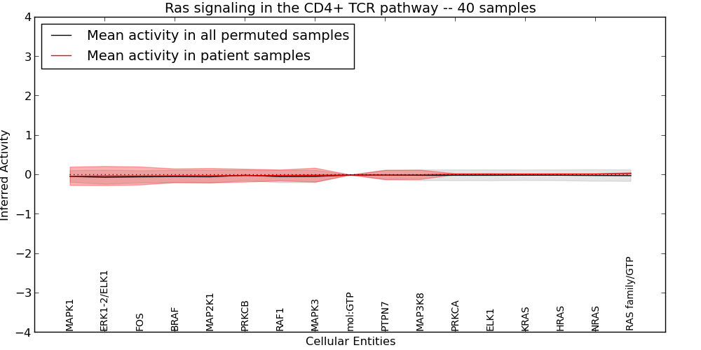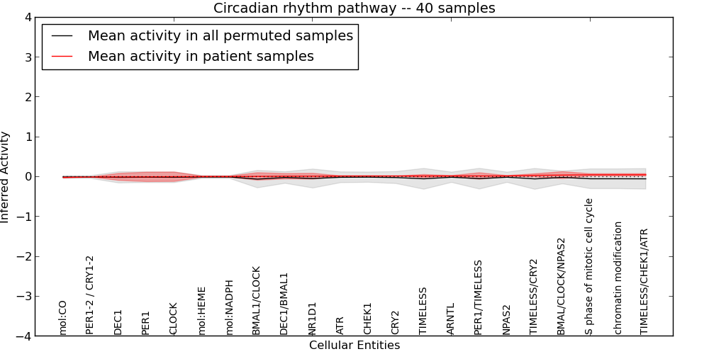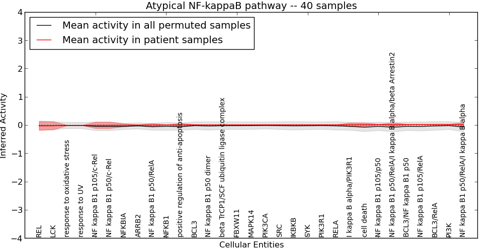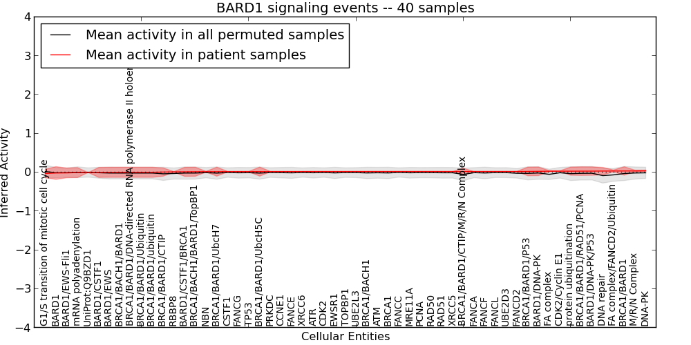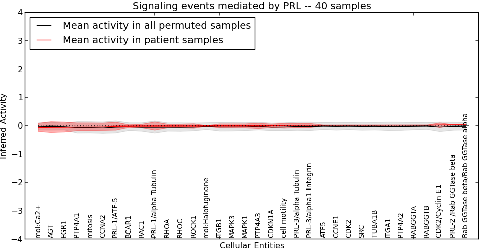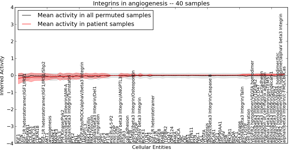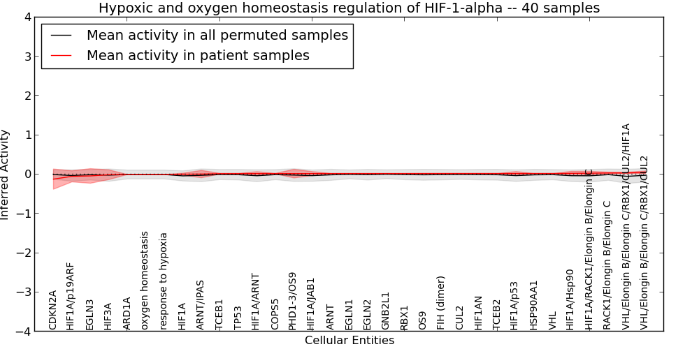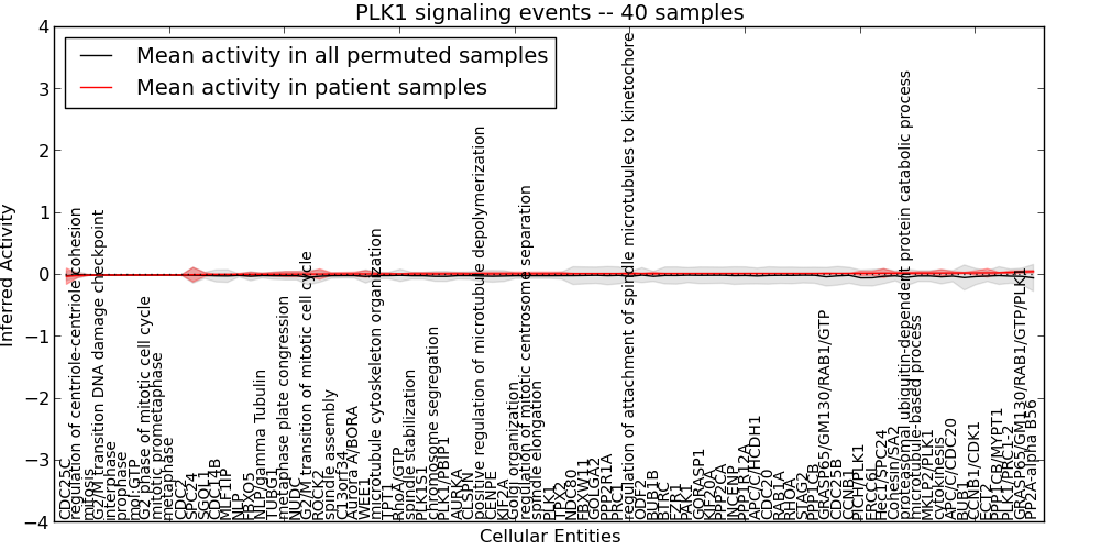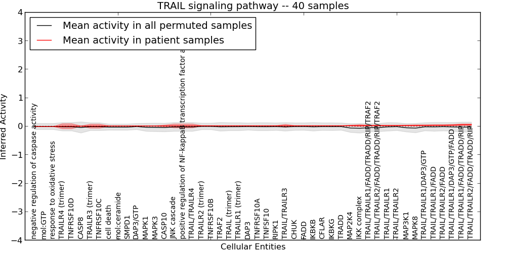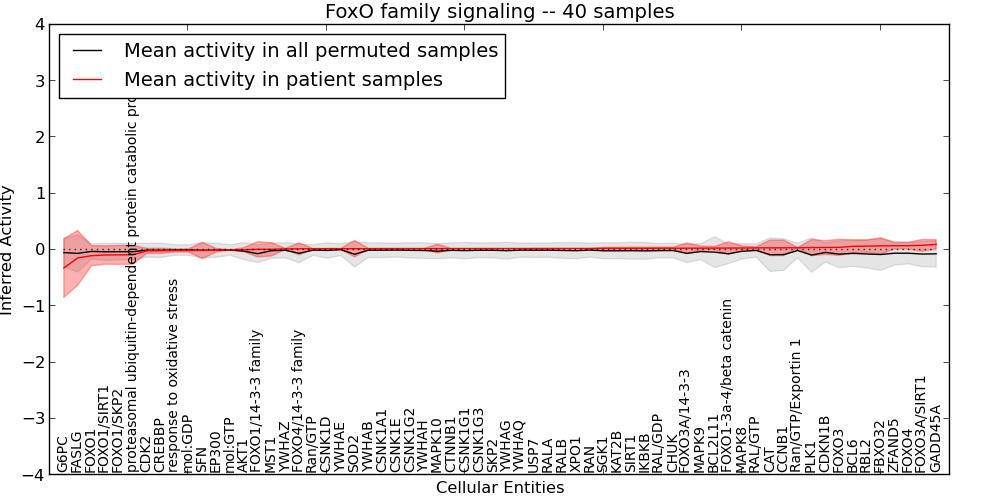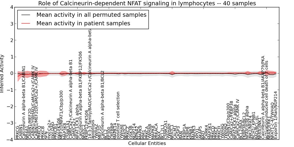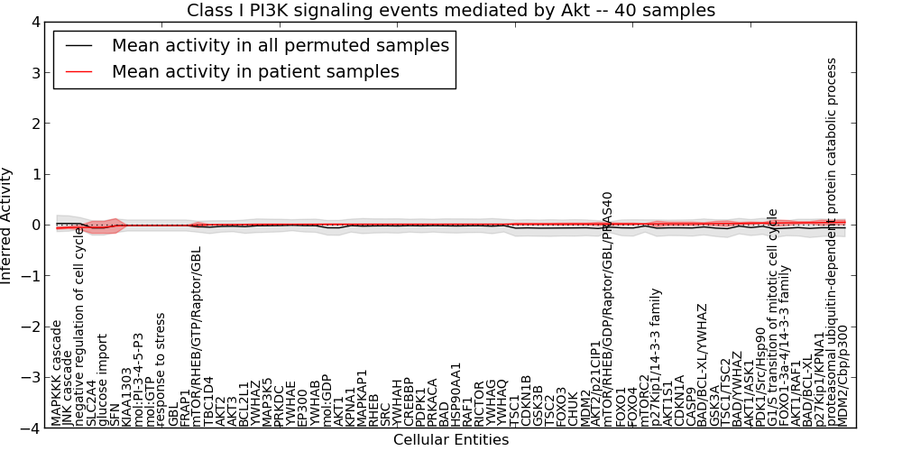 Figure S130. Get High-res Image This plot shows pathway concept perturbations across all samples against a permutation model. The concepts along the x-axis are sorted by lowest to highest mean activity for the real patient samples. Mean inferred activities are plotted along the y-axis as a colored band showing the average level and one standard deviation range. Real samples are shown in red and permuted samples in black.
