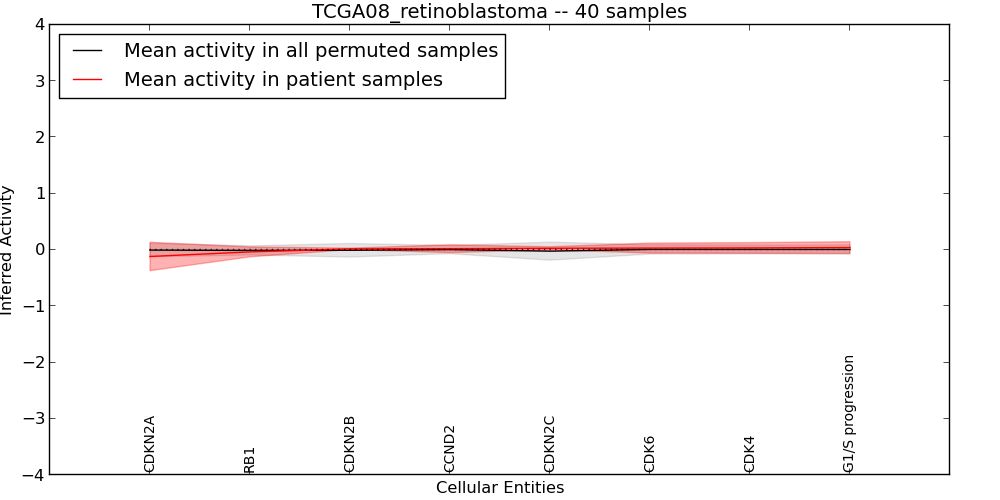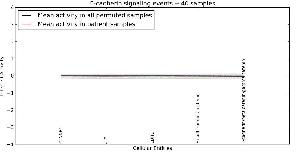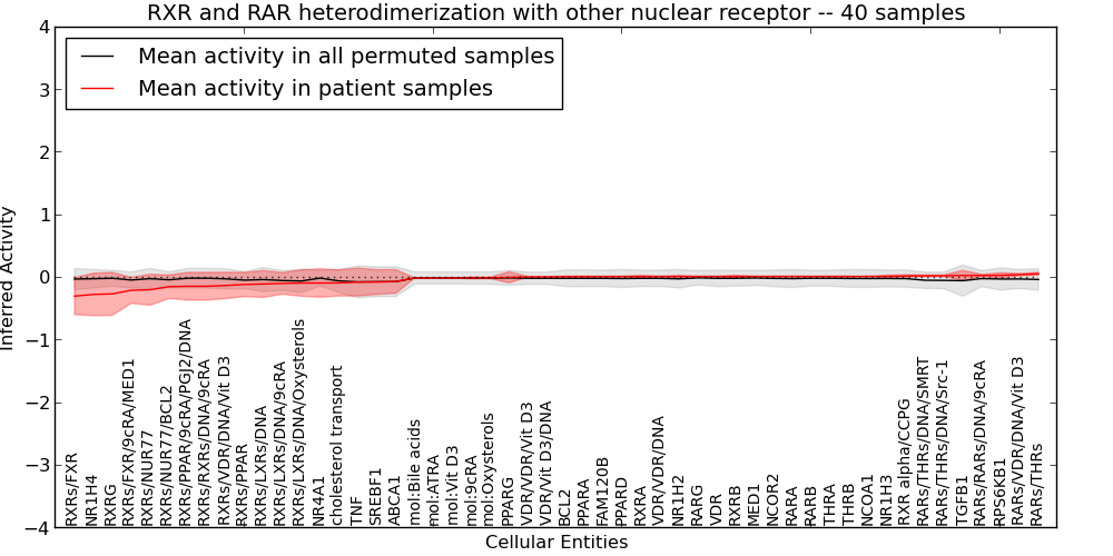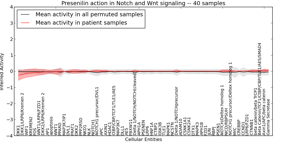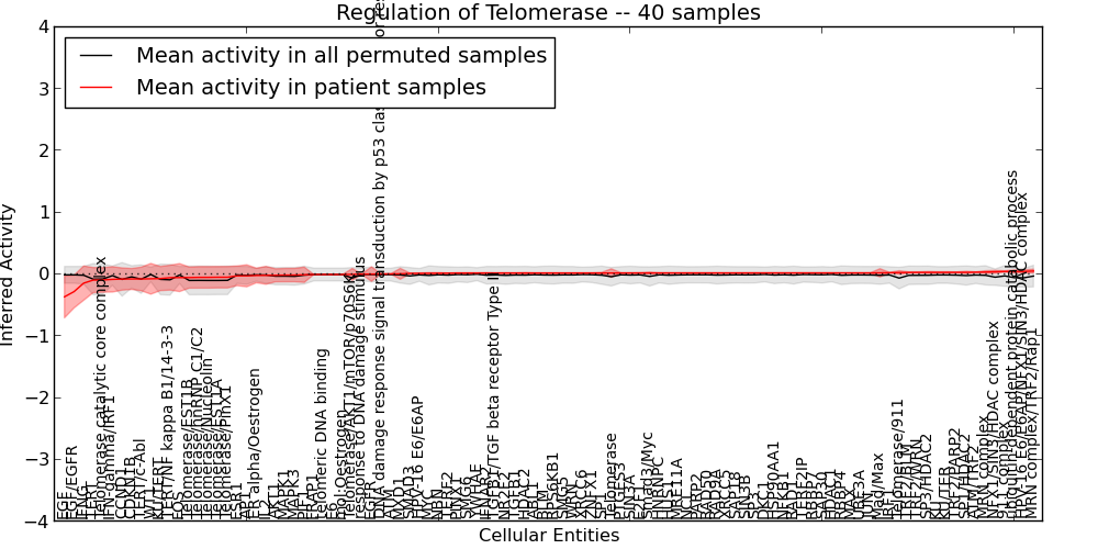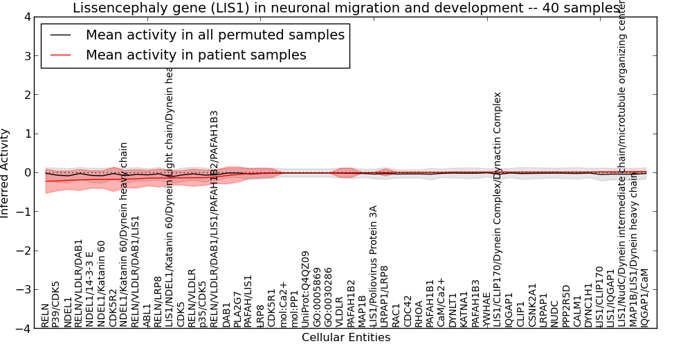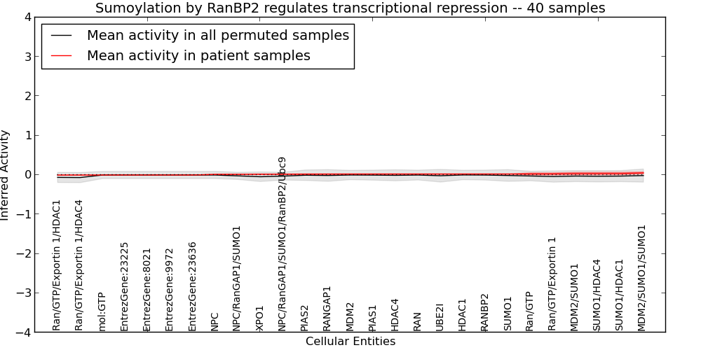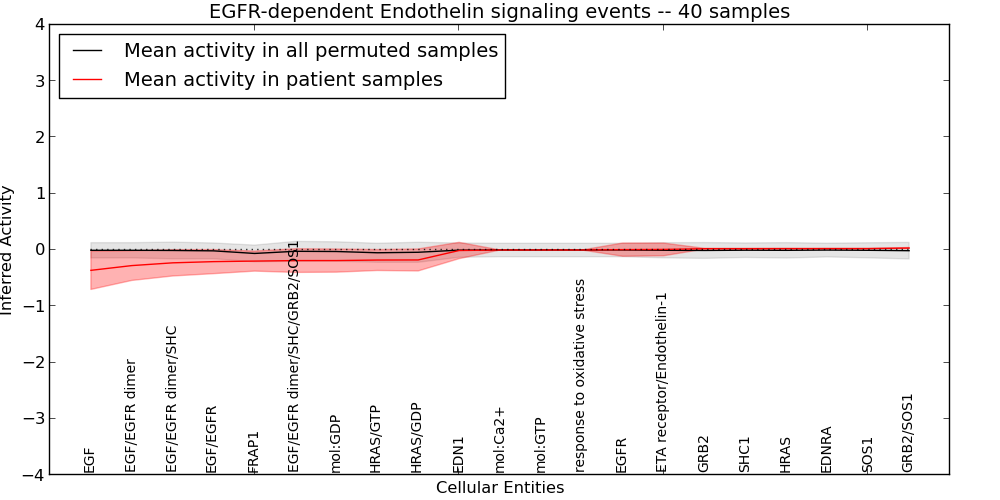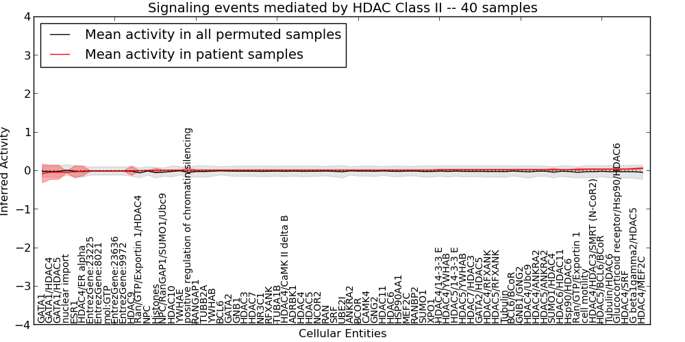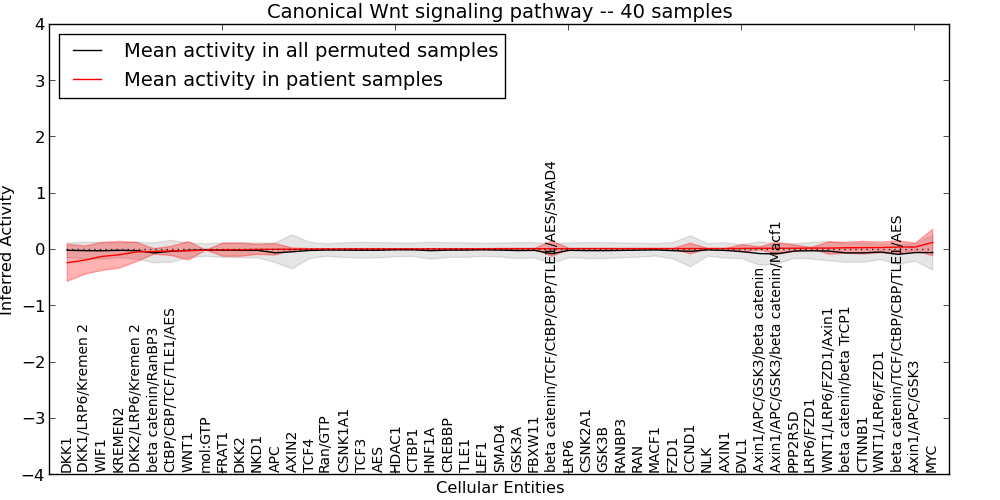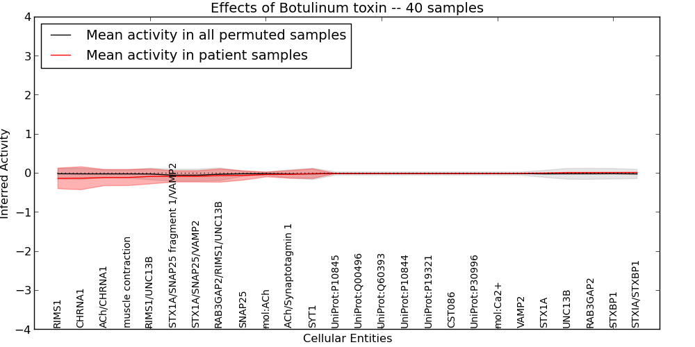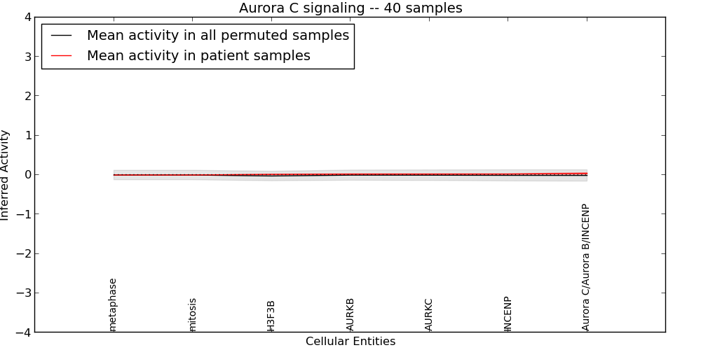 Figure S130. Get High-res Image This plot shows pathway concept perturbations across all samples against a permutation model. The concepts along the x-axis are sorted by lowest to highest mean activity for the real patient samples. Mean inferred activities are plotted along the y-axis as a colored band showing the average level and one standard deviation range. Real samples are shown in red and permuted samples in black.