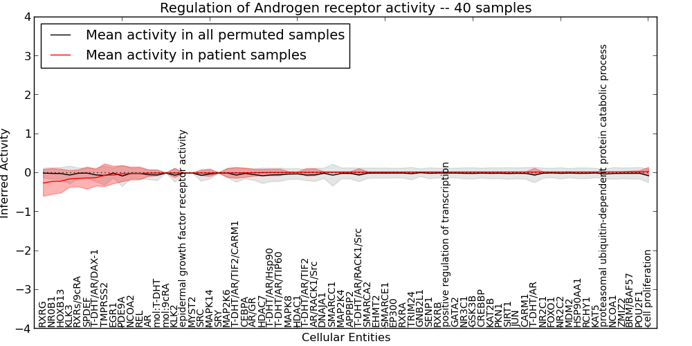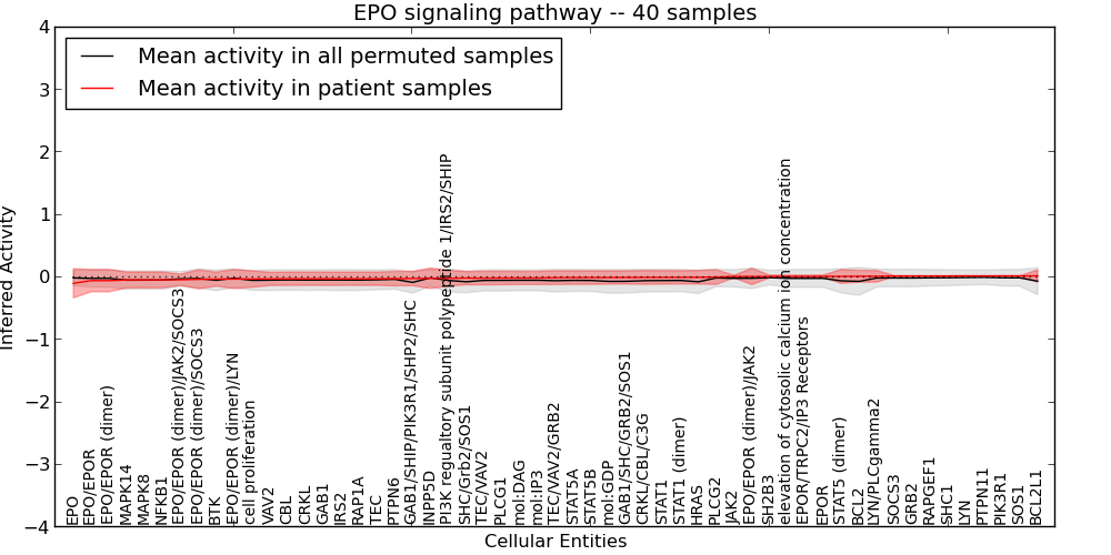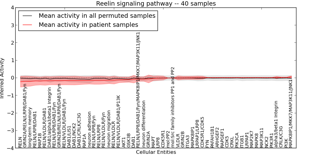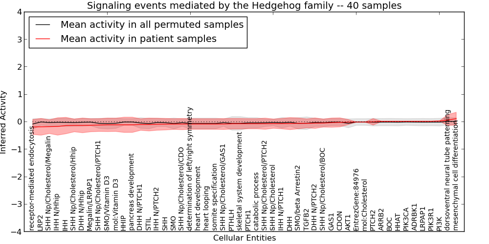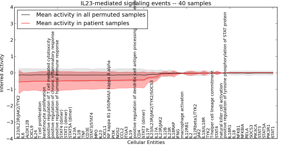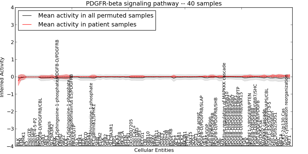 Figure S131. Get High-res Image This plot shows pathway concept perturbations across all samples against a permutation model. The concepts along the x-axis are sorted by lowest to highest mean activity for the real patient samples. Mean inferred activities are plotted along the y-axis as a colored band showing the average level and one standard deviation range. Real samples are shown in red and permuted samples in black.