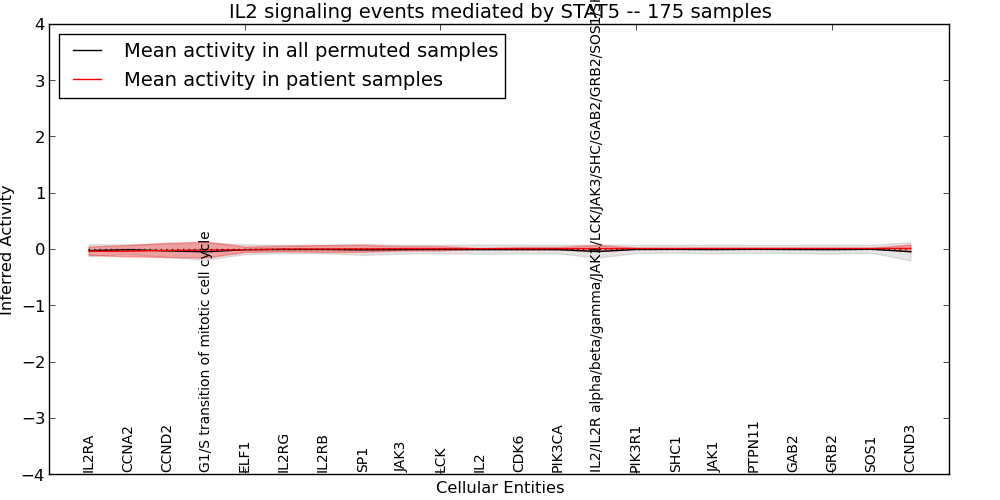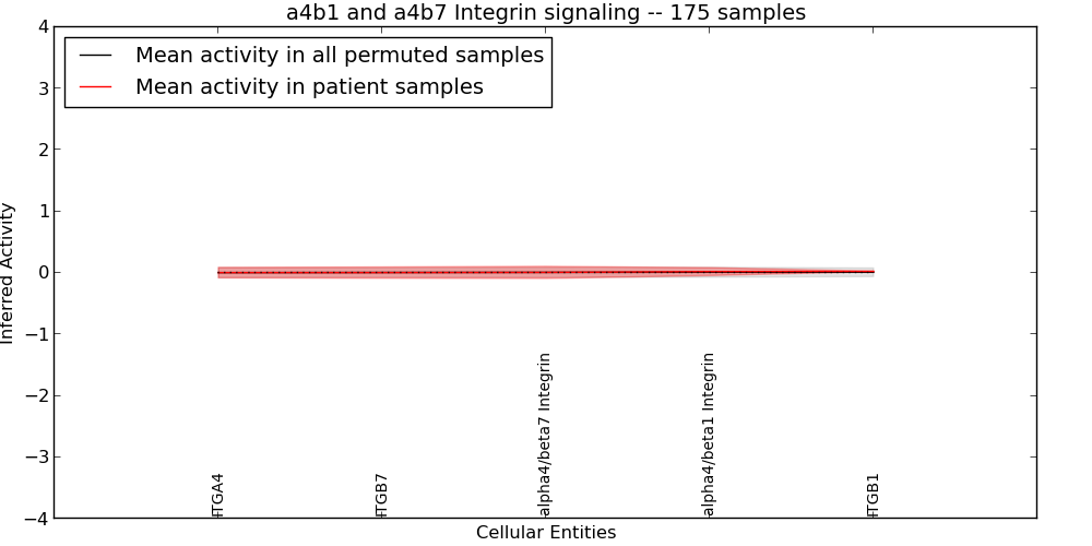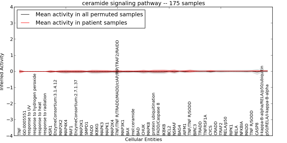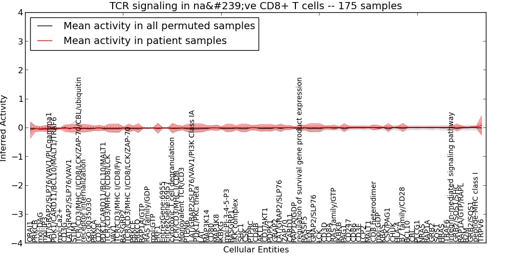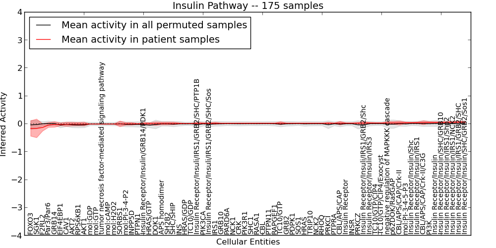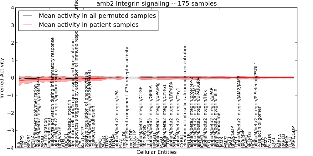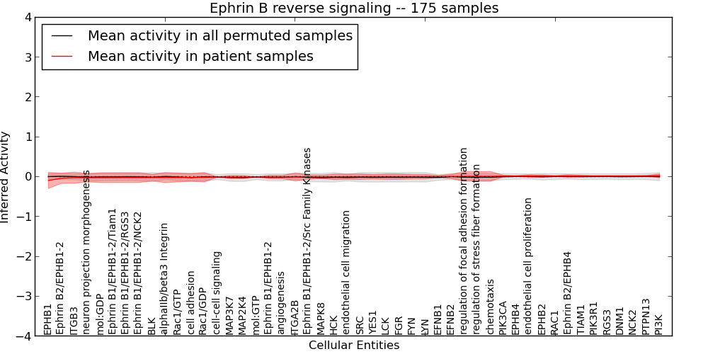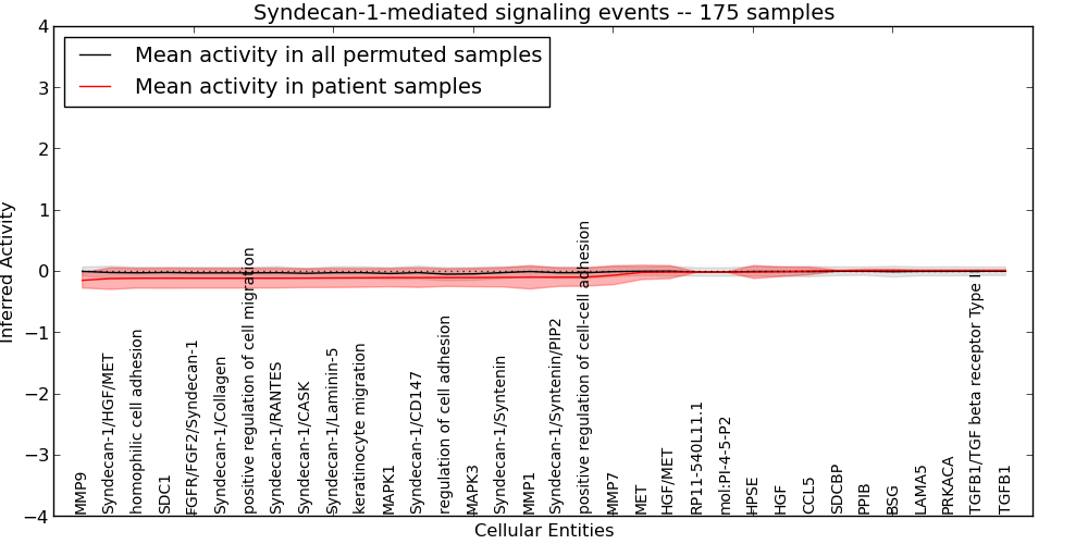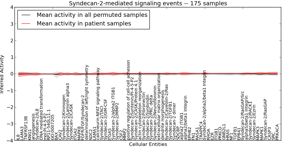 Figure S131. Get High-res Image This plot shows pathway concept perturbations across all samples against a permutation model. The concepts along the x-axis are sorted by lowest to highest mean activity for the real patient samples. Mean inferred activities are plotted along the y-axis as a colored band showing the average level and one standard deviation range. Real samples are shown in red and permuted samples in black.