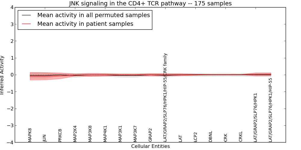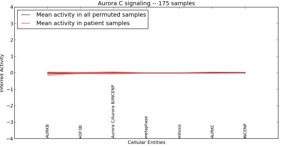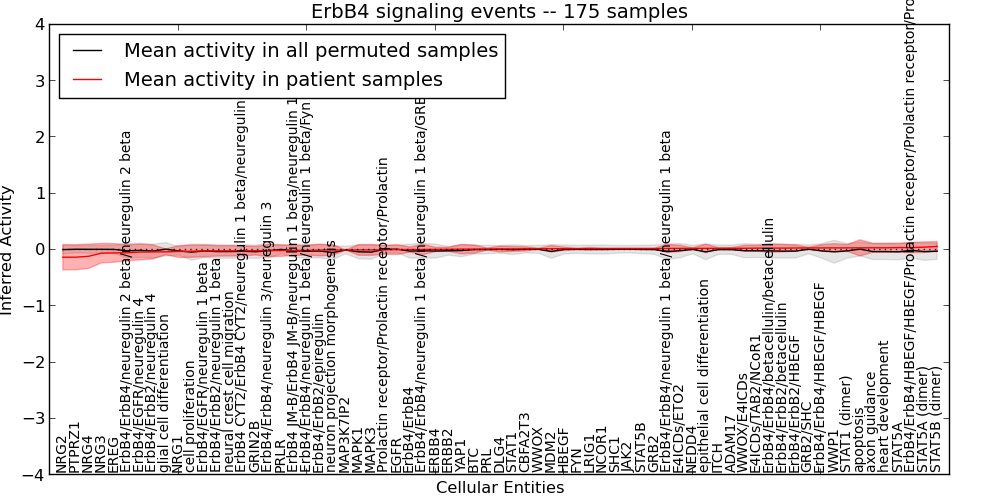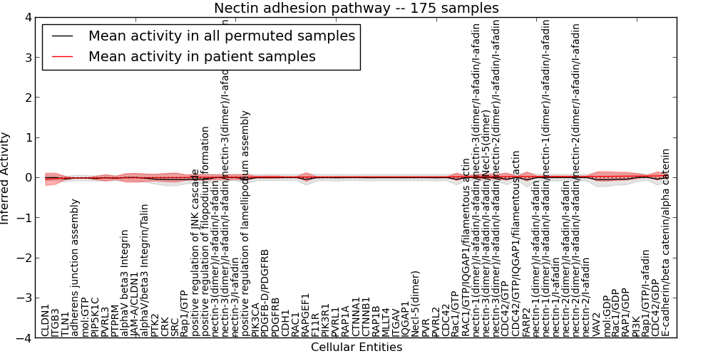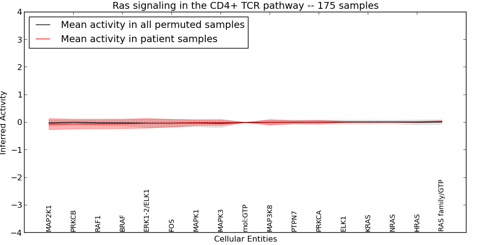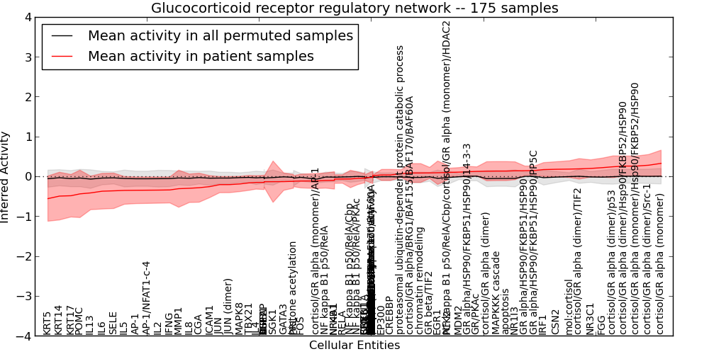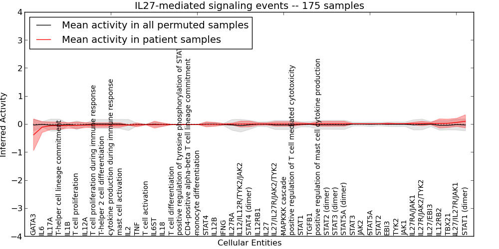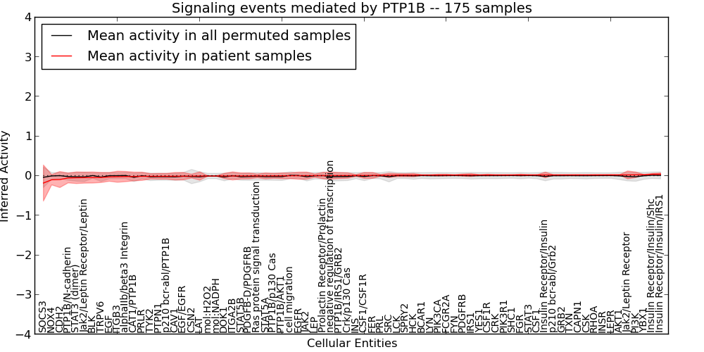 Figure S131. Get High-res Image This plot shows pathway concept perturbations across all samples against a permutation model. The concepts along the x-axis are sorted by lowest to highest mean activity for the real patient samples. Mean inferred activities are plotted along the y-axis as a colored band showing the average level and one standard deviation range. Real samples are shown in red and permuted samples in black.