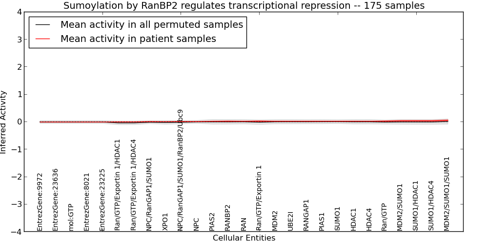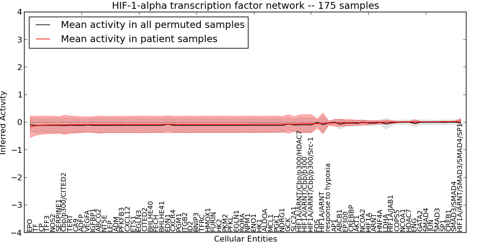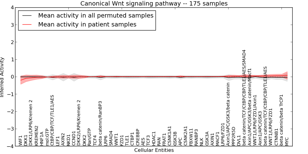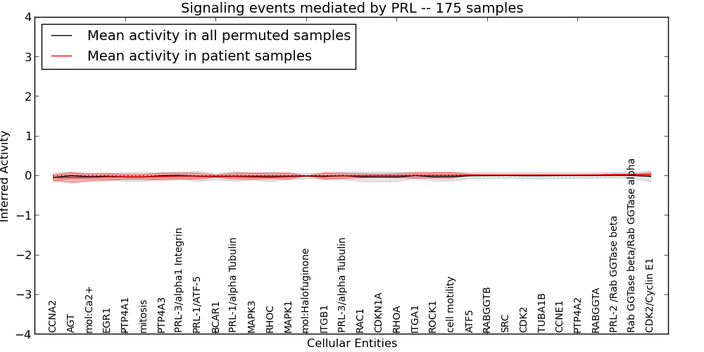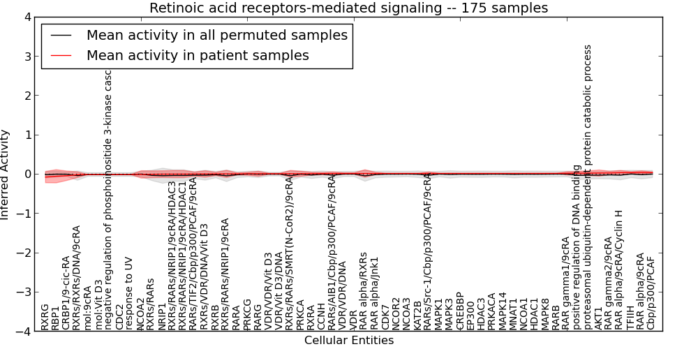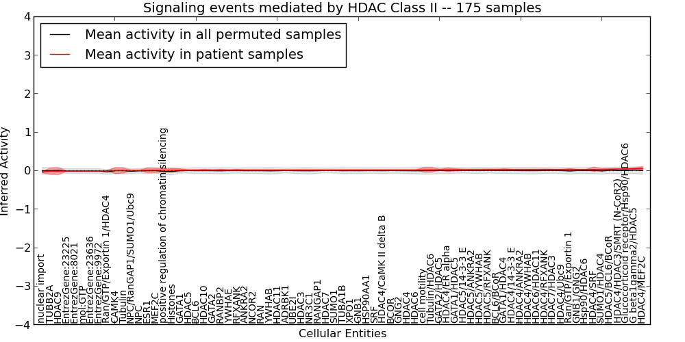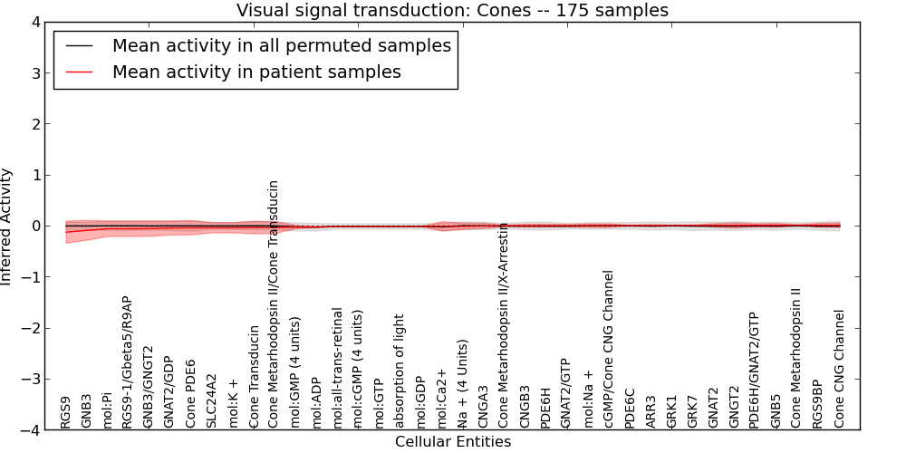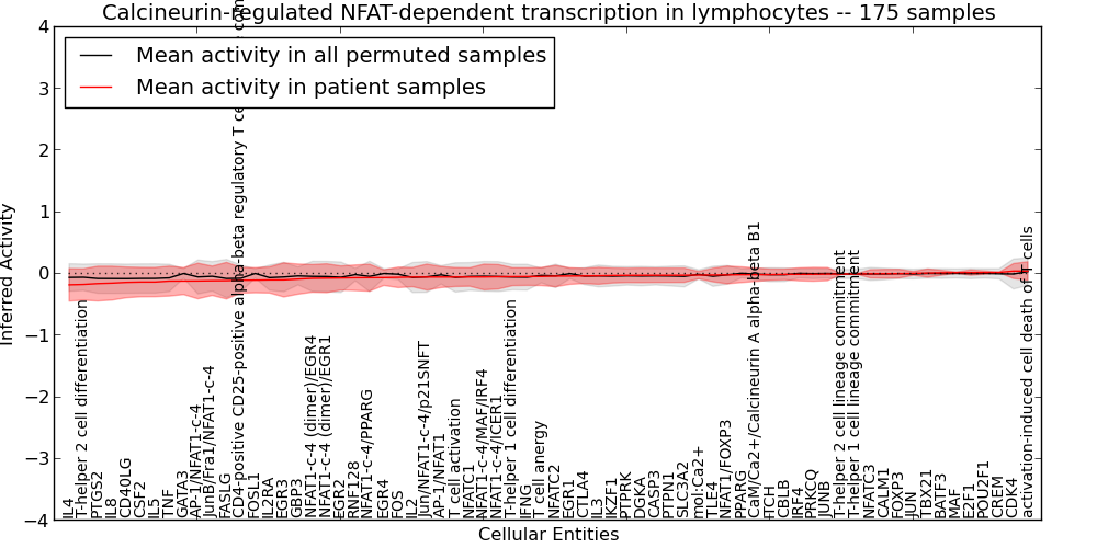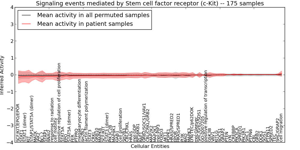 Figure S131. Get High-res Image This plot shows pathway concept perturbations across all samples against a permutation model. The concepts along the x-axis are sorted by lowest to highest mean activity for the real patient samples. Mean inferred activities are plotted along the y-axis as a colored band showing the average level and one standard deviation range. Real samples are shown in red and permuted samples in black.