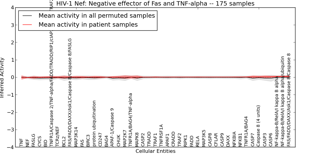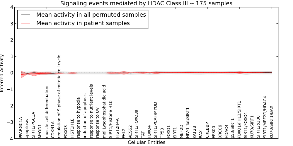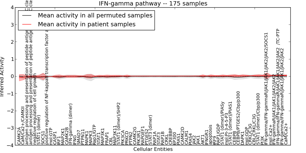 Figure S130. Get High-res Image This plot shows pathway concept perturbations across all samples against a permutation model. The concepts along the x-axis are sorted by lowest to highest mean activity for the real patient samples. Mean inferred activities are plotted along the y-axis as a colored band showing the average level and one standard deviation range. Real samples are shown in red and permuted samples in black.