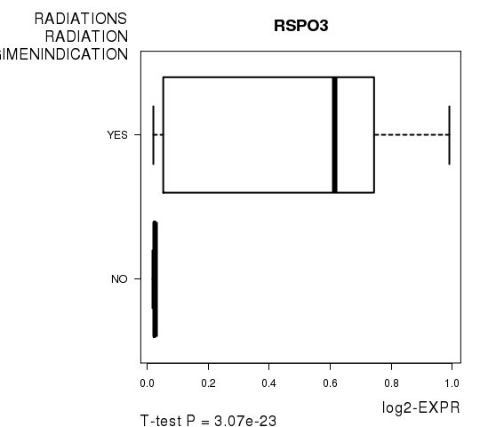 Figure S3. Get High-res Image As an example, this figure shows the association of RSPO3 to 'RADIATIONS.RADIATION.REGIMENINDICATION'. P value = 3.07e-23 with T-test analysis.