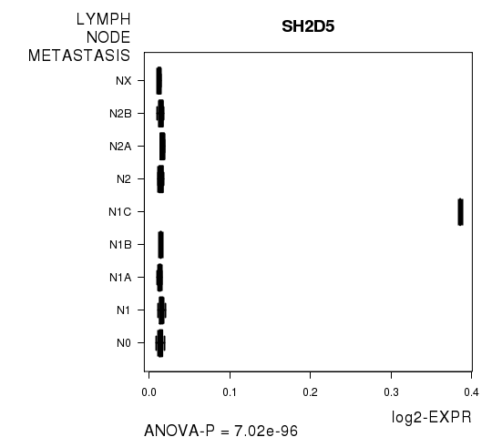 Figure S5. Get High-res Image As an example, this figure shows the association of SH2D5 to 'LYMPH.NODE.METASTASIS'. P value = 7.02e-96 with ANOVA analysis.