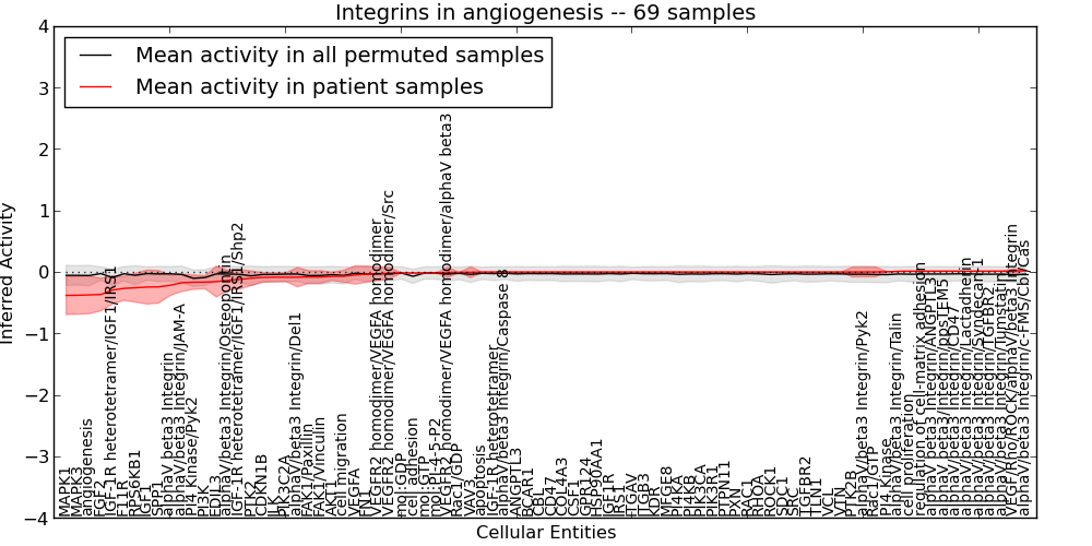 Figure S131.  Get High-res Image This plot shows pathway concept perturbations across all samples against a permutation model. The concepts along the x-axis are sorted by lowest to highest mean activity for the real patient samples. Mean inferred activities are plotted along the y-axis as a colored band showing the average level and one standard deviation range. Real samples are shown in red and permuted samples in black.