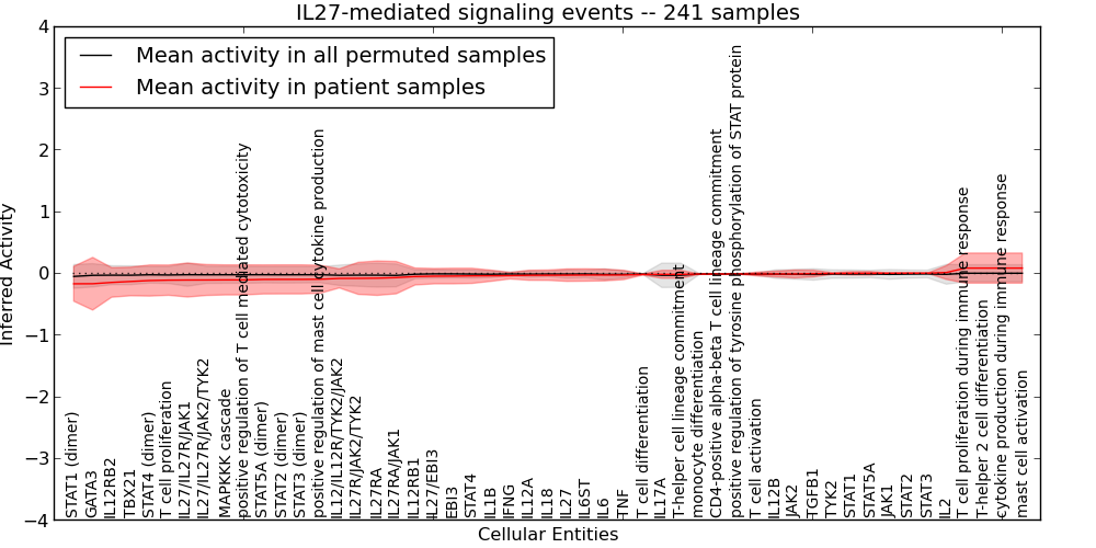 Figure S131. Get High-res Image This plot shows pathway concept perturbations across all samples against a permutation model. The concepts along the x-axis are sorted by lowest to highest mean activity for the real patient samples. Mean inferred activities are plotted along the y-axis as a colored band showing the average level and one standard deviation range. Real samples are shown in red and permuted samples in black.