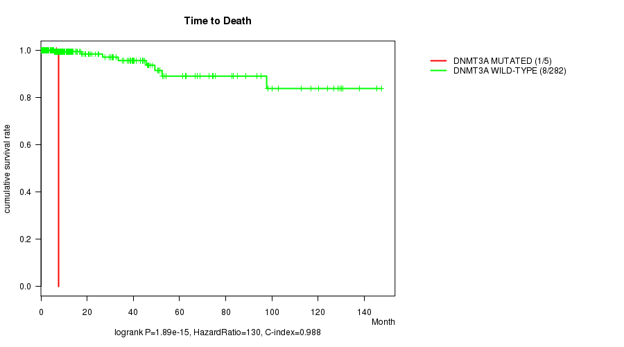 Figure S6. Get High-res Image Gene #28: 'DNMT3A MUTATION STATUS' versus Clinical Feature #1: 'Time to Death'