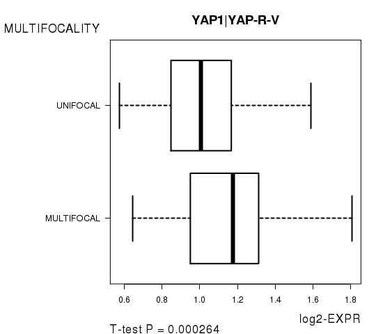 Figure S10. Get High-res Image As an example, this figure shows the association of YAP1|YAP-R-V to 'MULTIFOCALITY'. P value = 0.000264 with T-test analysis.