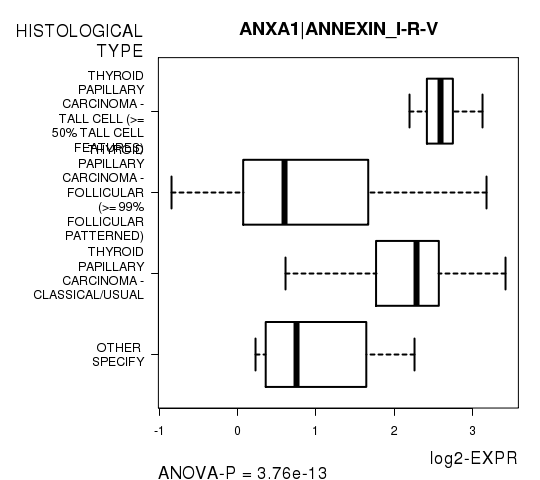 Figure S2. Get High-res Image As an example, this figure shows the association of ANXA1|ANNEXIN_I-R-V to 'HISTOLOGICAL.TYPE'. P value = 3.76e-13 with ANOVA analysis.