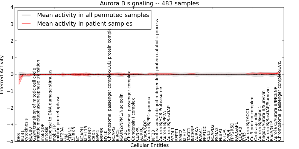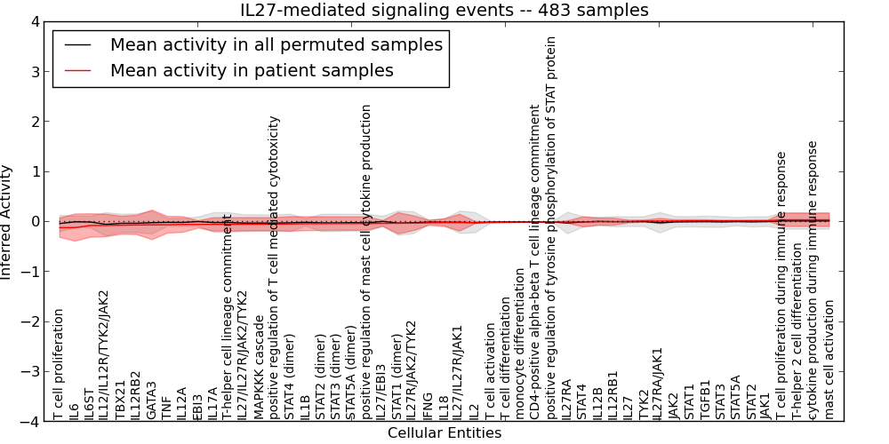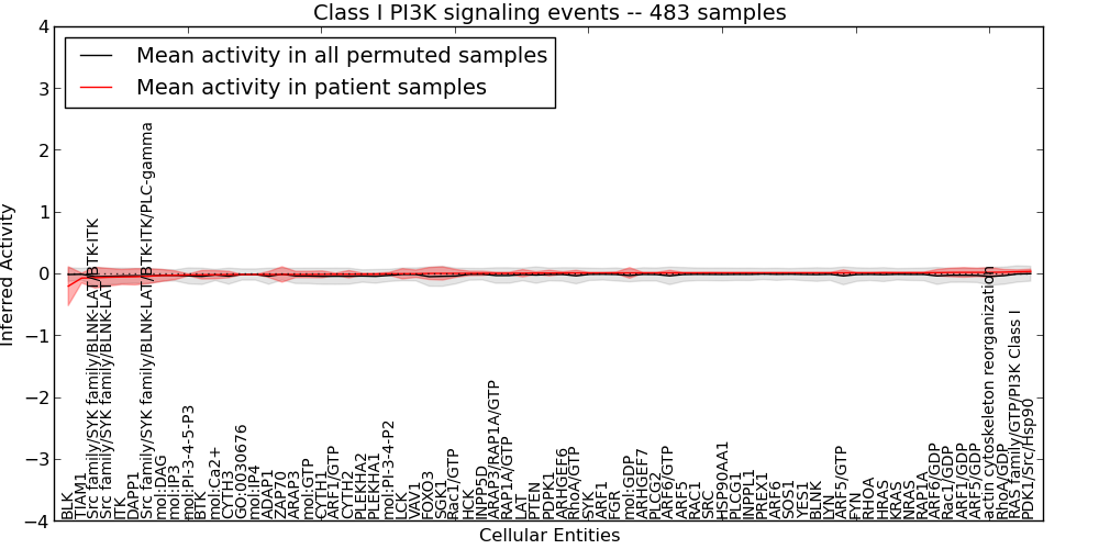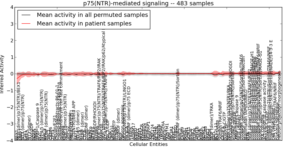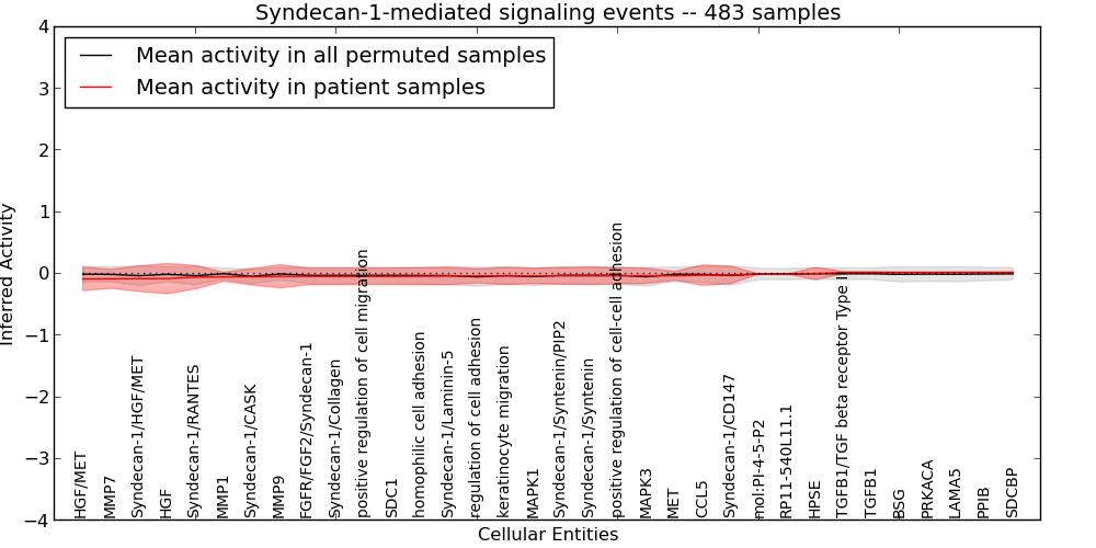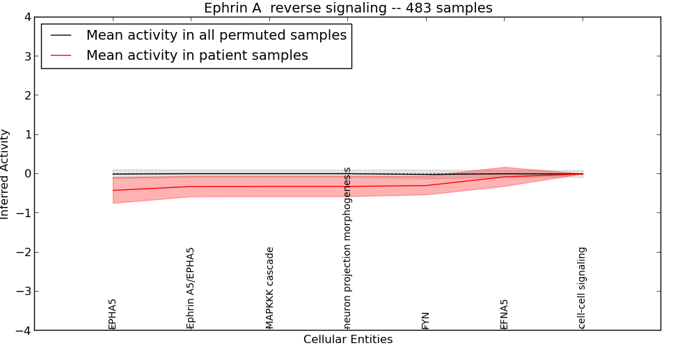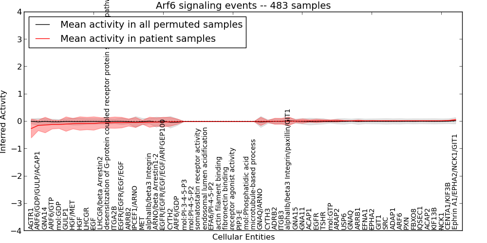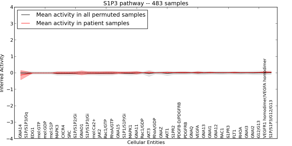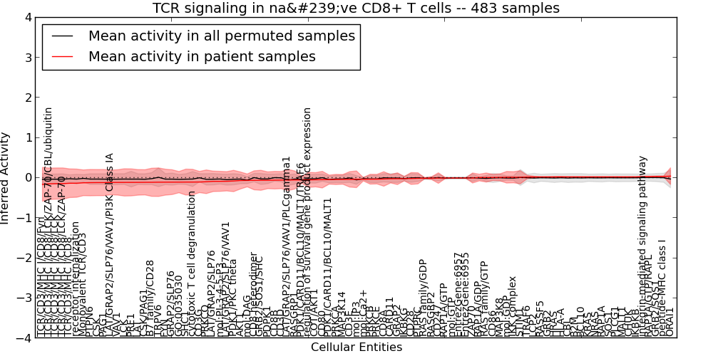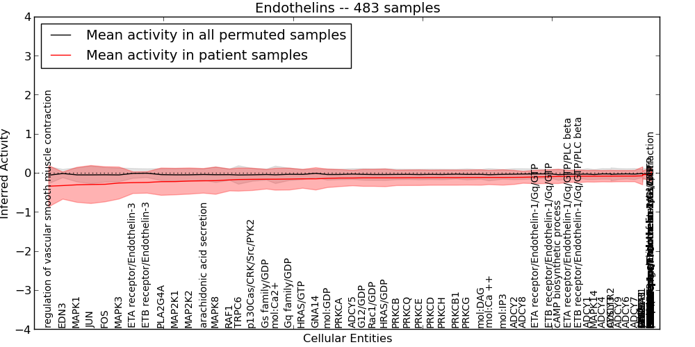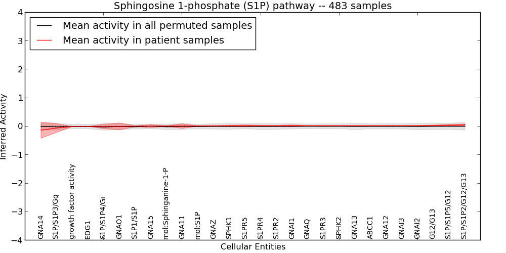Figure S130. Get High-res Image This plot shows pathway concept perturbations across all samples against a permutation model. The concepts along the x-axis are sorted by lowest to highest mean activity for the real patient samples. Mean inferred activities are plotted along the y-axis as a colored band showing the average level and one standard deviation range. Real samples are shown in red and permuted samples in black.