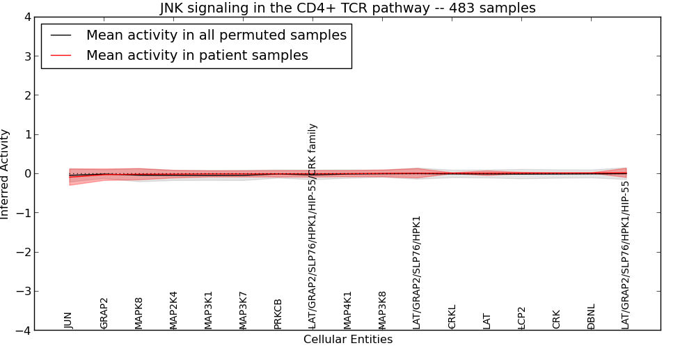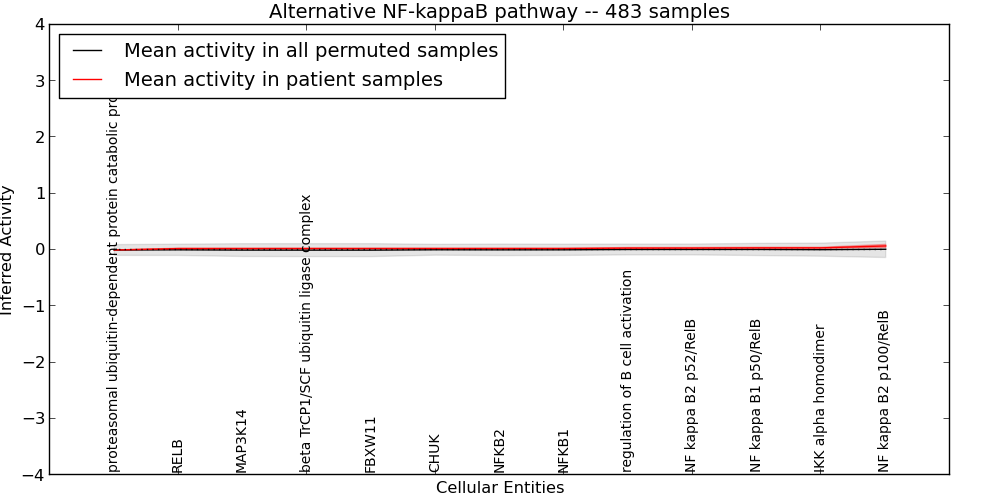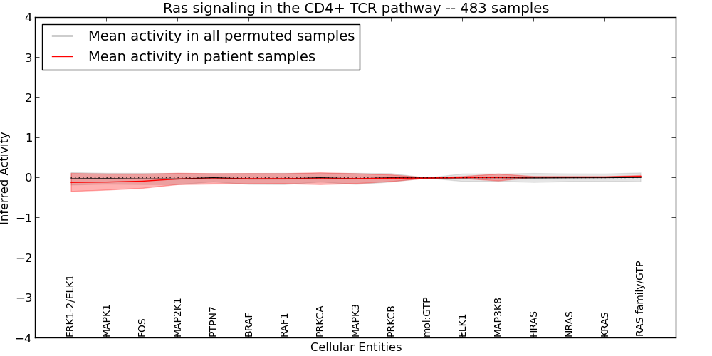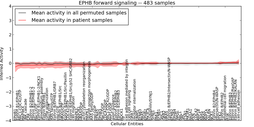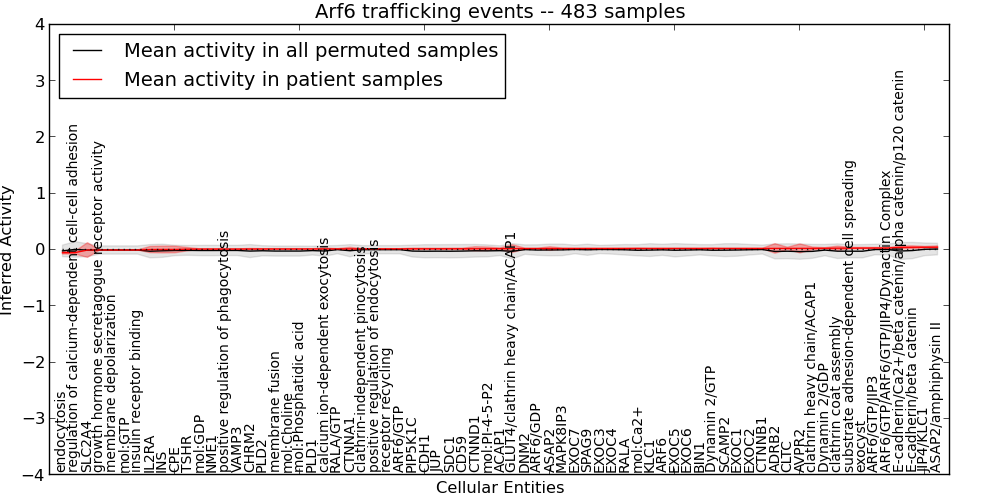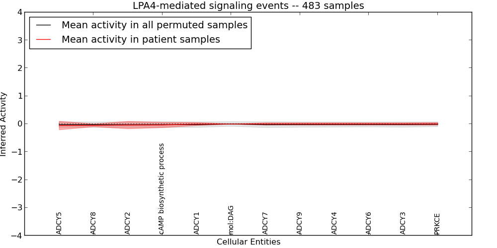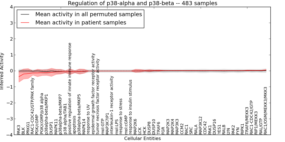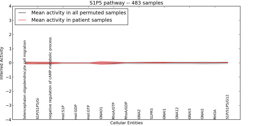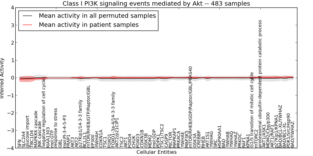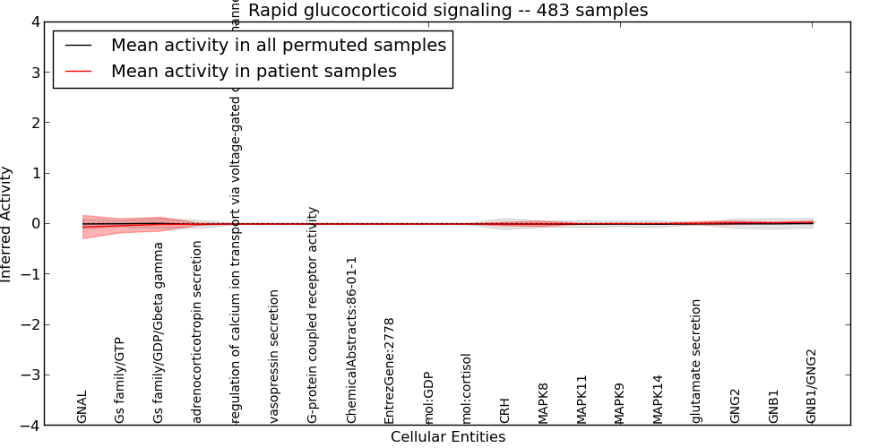 Figure S130. Get High-res Image This plot shows pathway concept perturbations across all samples against a permutation model. The concepts along the x-axis are sorted by lowest to highest mean activity for the real patient samples. Mean inferred activities are plotted along the y-axis as a colored band showing the average level and one standard deviation range. Real samples are shown in red and permuted samples in black.