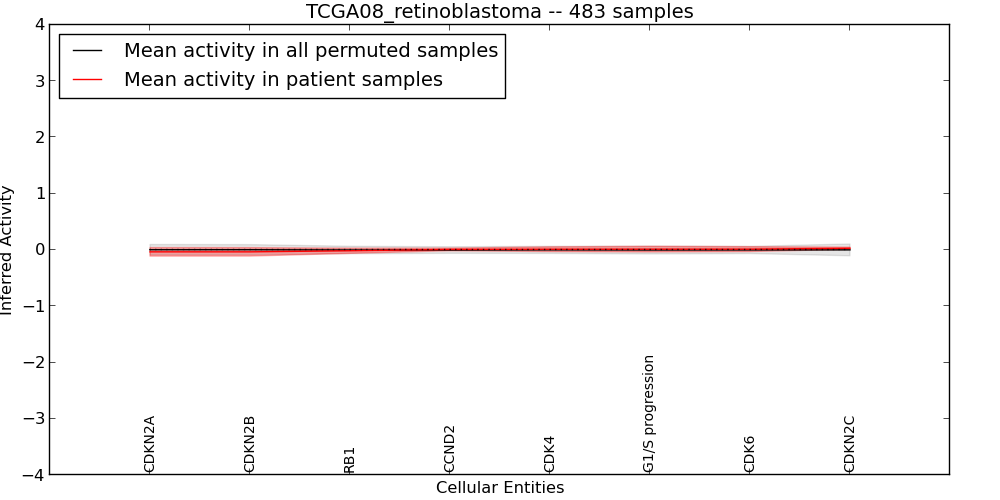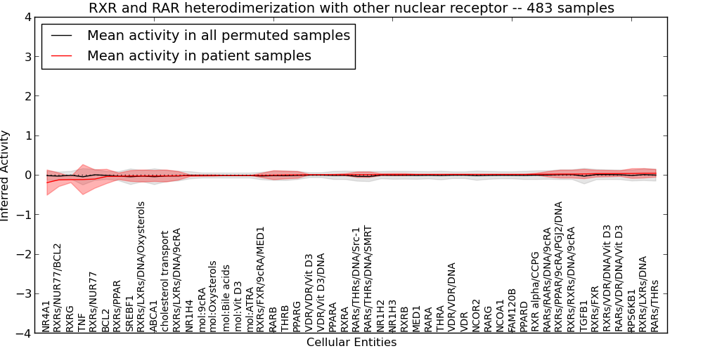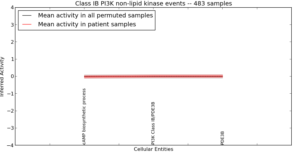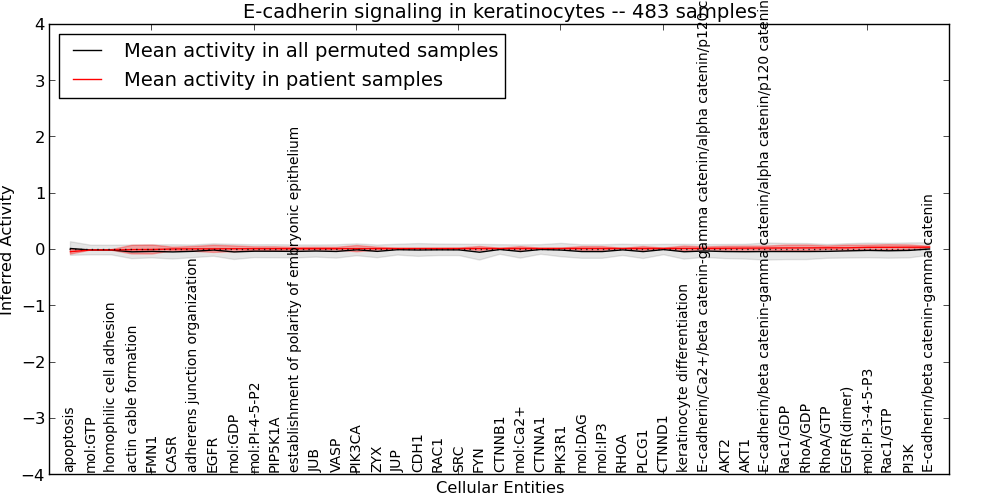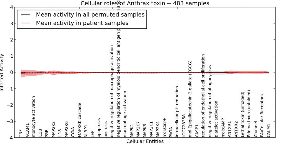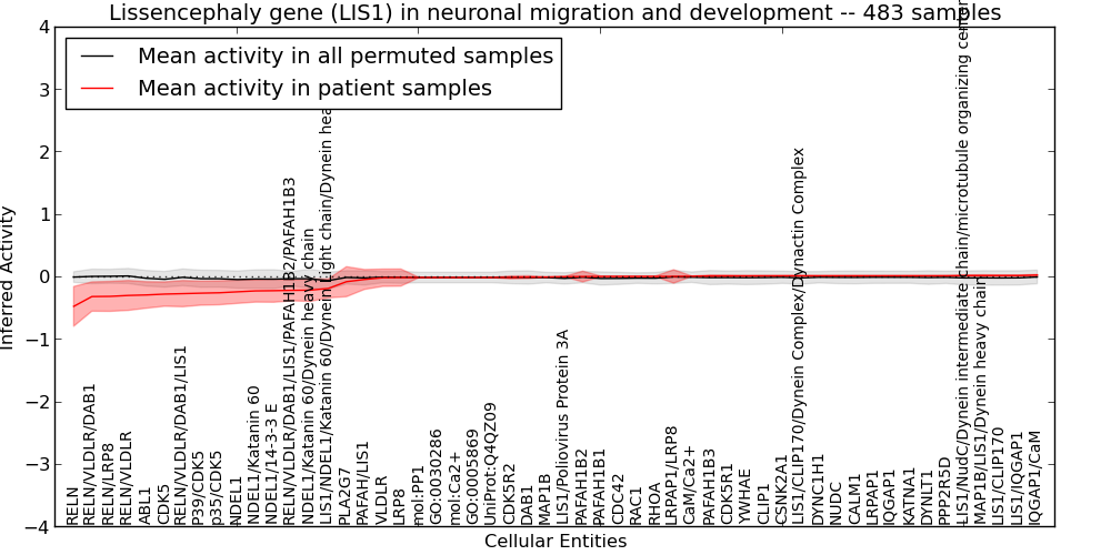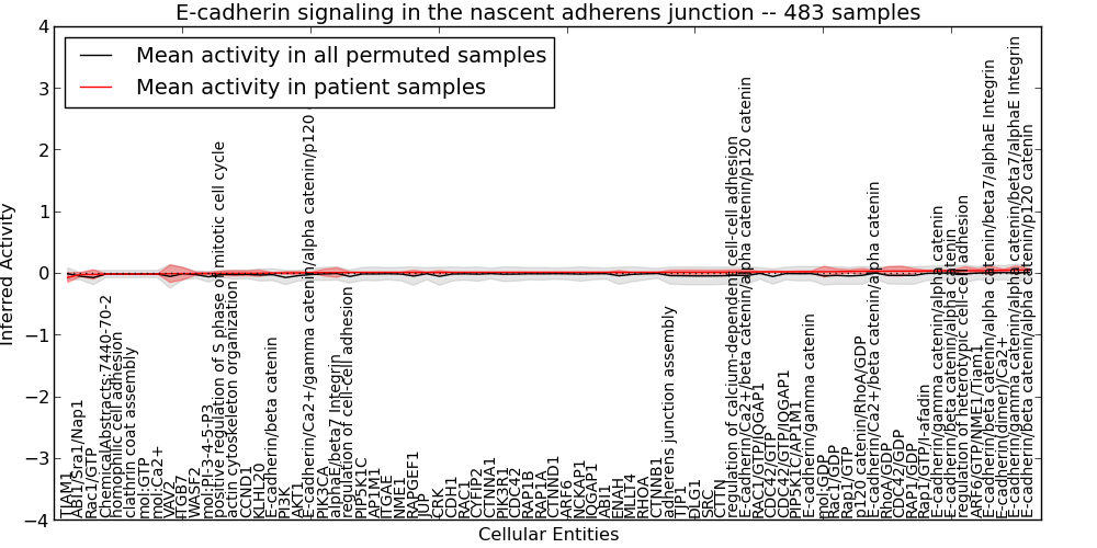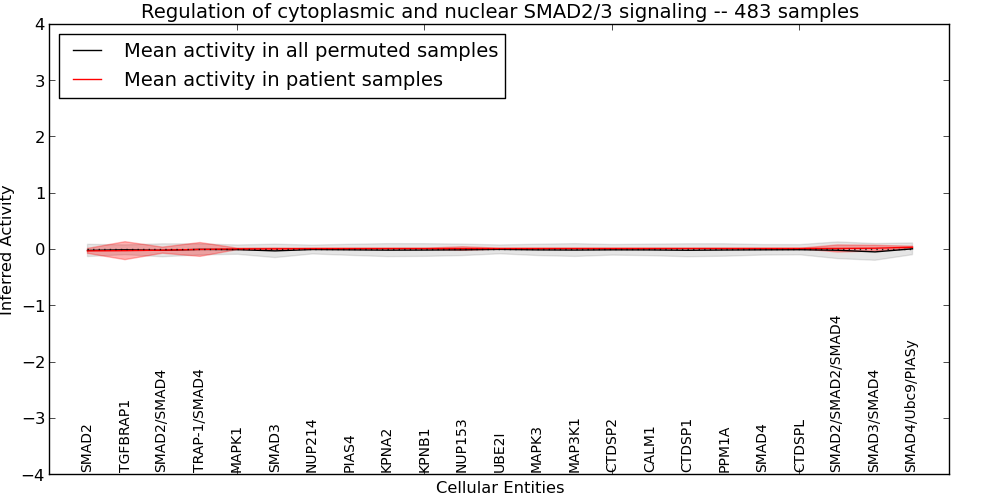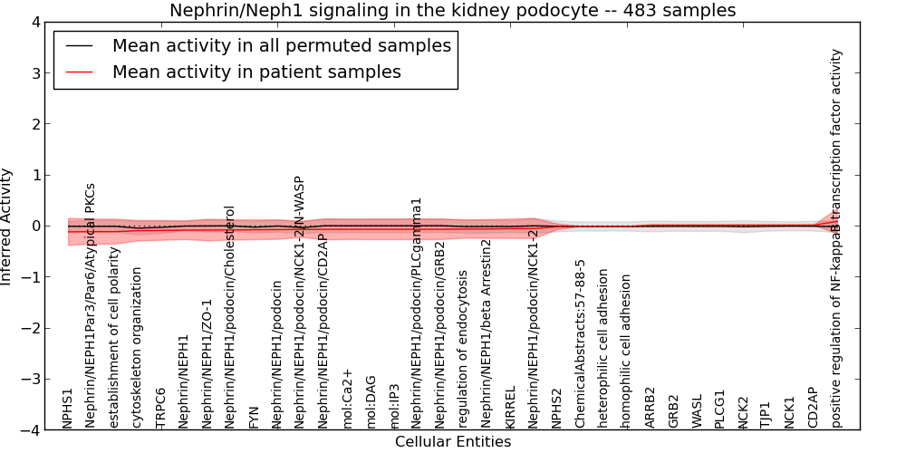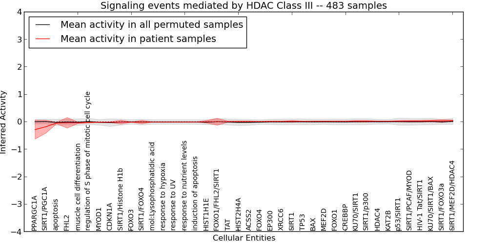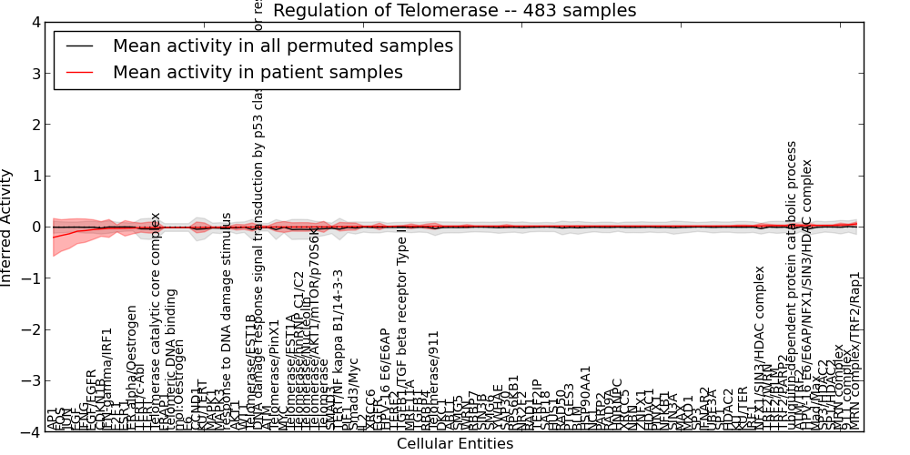 Figure S130. Get High-res Image This plot shows pathway concept perturbations across all samples against a permutation model. The concepts along the x-axis are sorted by lowest to highest mean activity for the real patient samples. Mean inferred activities are plotted along the y-axis as a colored band showing the average level and one standard deviation range. Real samples are shown in red and permuted samples in black.