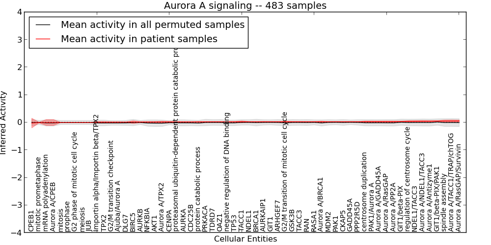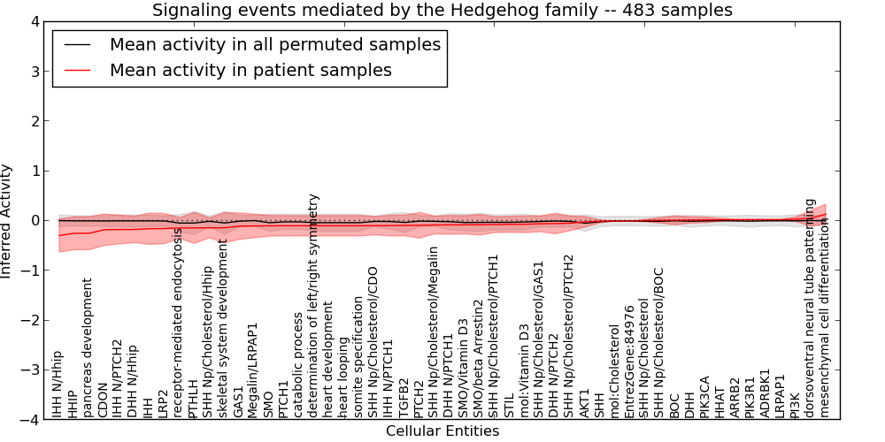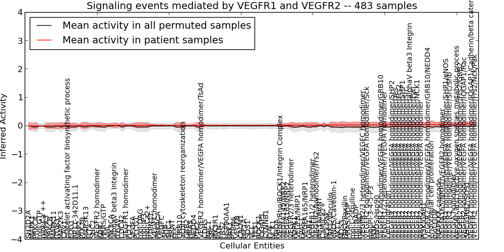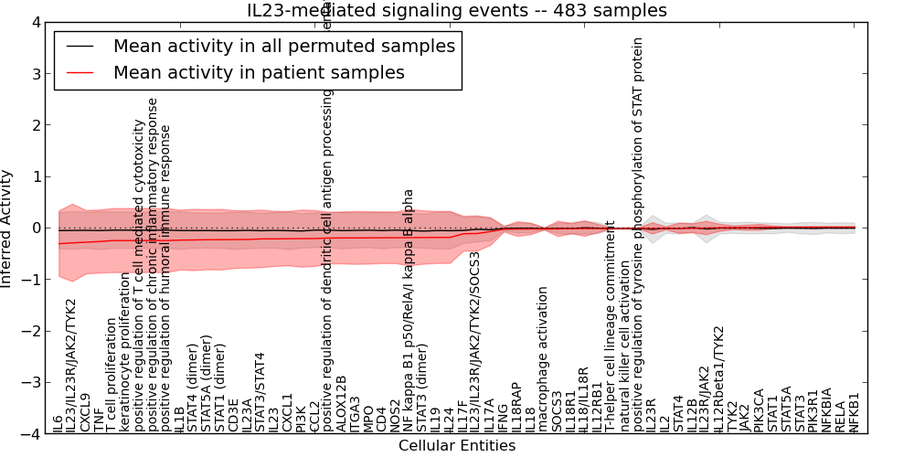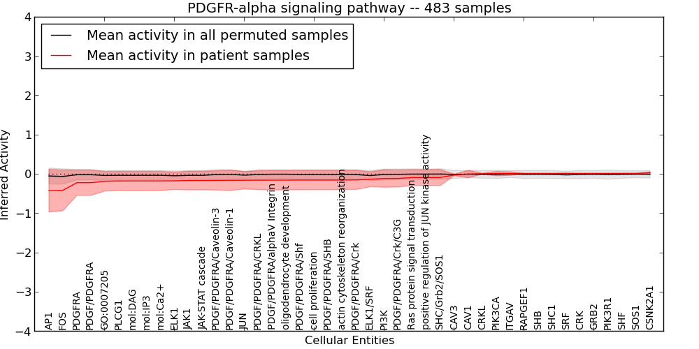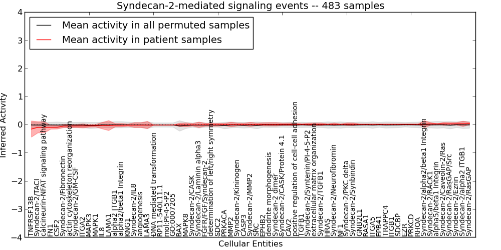 Figure S131. Get High-res Image This plot shows pathway concept perturbations across all samples against a permutation model. The concepts along the x-axis are sorted by lowest to highest mean activity for the real patient samples. Mean inferred activities are plotted along the y-axis as a colored band showing the average level and one standard deviation range. Real samples are shown in red and permuted samples in black.