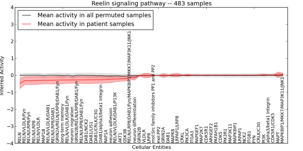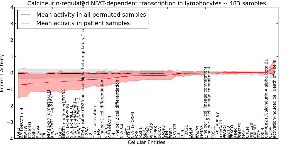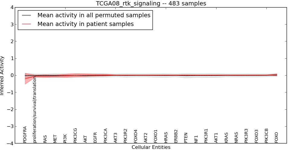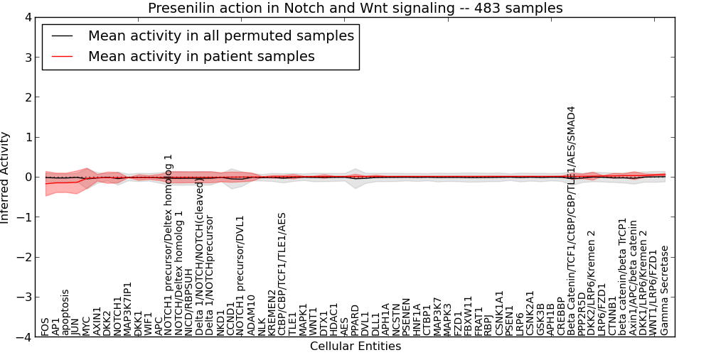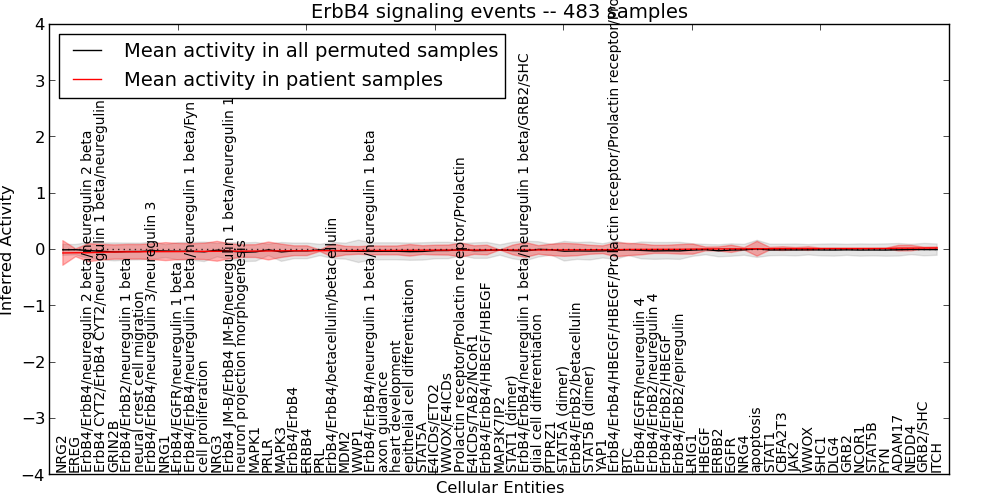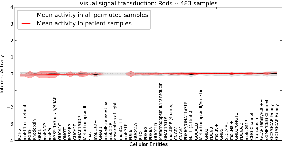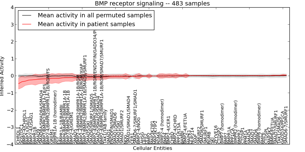 Figure S131. Get High-res Image This plot shows pathway concept perturbations across all samples against a permutation model. The concepts along the x-axis are sorted by lowest to highest mean activity for the real patient samples. Mean inferred activities are plotted along the y-axis as a colored band showing the average level and one standard deviation range. Real samples are shown in red and permuted samples in black.