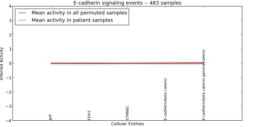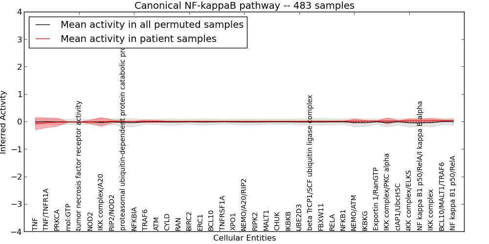 The significance of the IPL obtained for each concept in each patient sample is assessed using a permutation analysis. Importantly, the permutation analysis preserves data tuples so as to preserve any implicit correlations between the different data modalities. For example, genes that are deleted have concomitantly lower expression levels. Preserving the copy number and expression pairs therefore retains this data property. The simulation therefore makes "null samples" by permuting data tuples across all of the genes in the genome so that each gene in a null sample is associated with a random tuple of another gene with equal probability. This approach has the added benefit of preserving the pathway structure so that every observed IPL can be compared to a distribution of random IPLs derived from exactly the same interaction context. PARADIGM inferences are then obtained for 1000 "null" patients and serve as a background distribution to contrast the observed IPLs against. Pathway concepts are excluded from further analysis if they did not obtain a minimum IPL of 0.5 in any patient sample both observed or simulated.