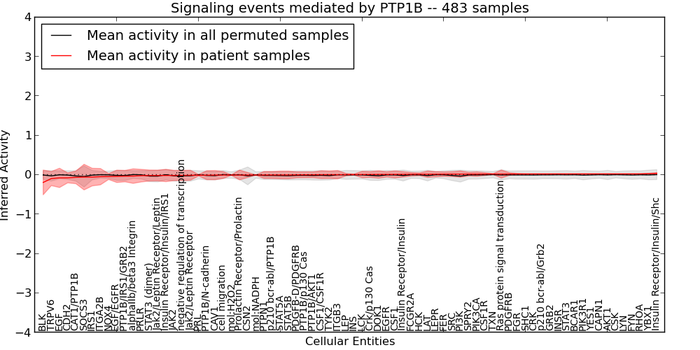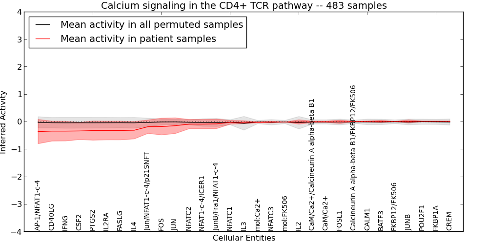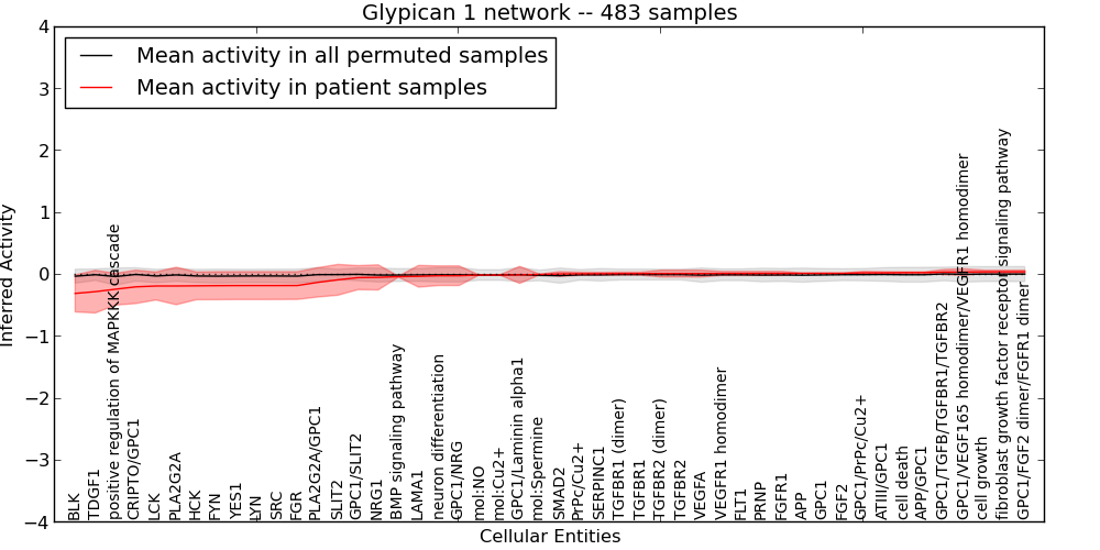 Figure S129. Get High-res Image This plot shows pathway concept perturbations across all samples against a permutation model. The concepts along the x-axis are sorted by lowest to highest mean activity for the real patient samples. Mean inferred activities are plotted along the y-axis as a colored band showing the average level and one standard deviation range. Real samples are shown in red and permuted samples in black.