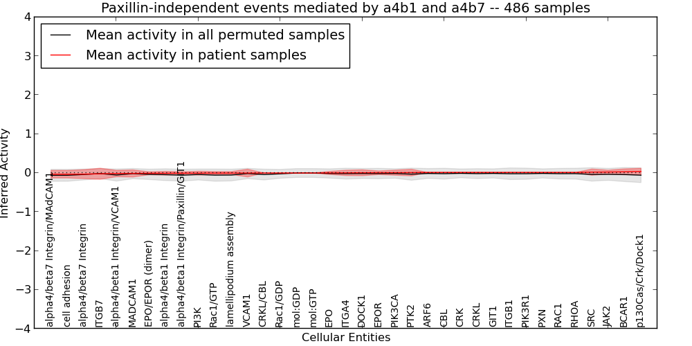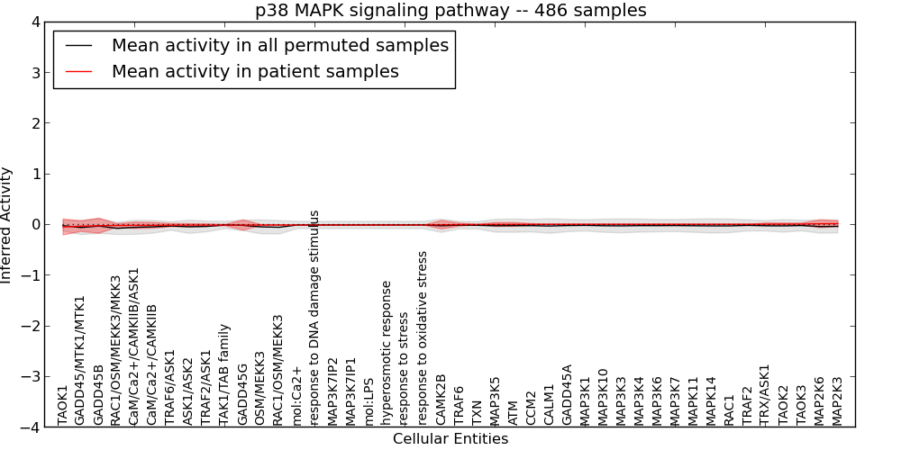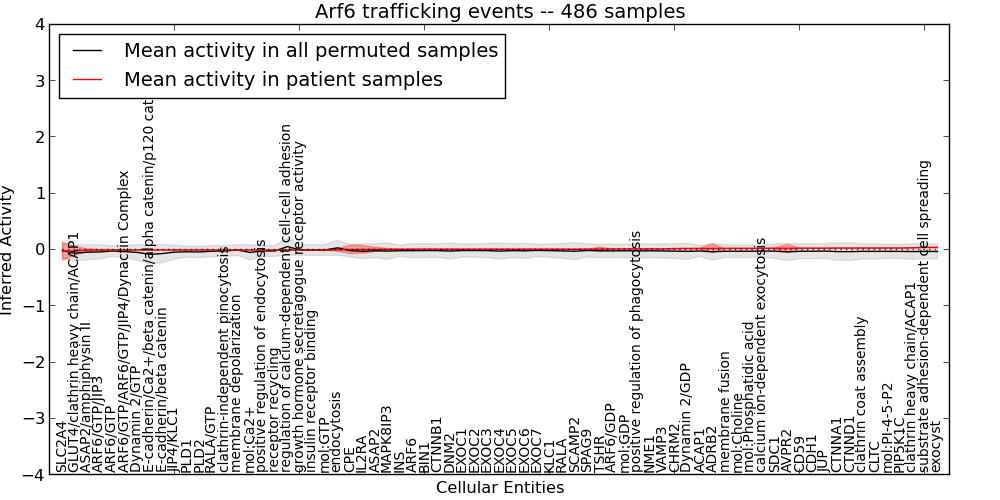 Figure S129. Get High-res Image This plot shows pathway concept perturbations across all samples against a permutation model. The concepts along the x-axis are sorted by lowest to highest mean activity for the real patient samples. Mean inferred activities are plotted along the y-axis as a colored band showing the average level and one standard deviation range. Real samples are shown in red and permuted samples in black.