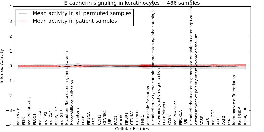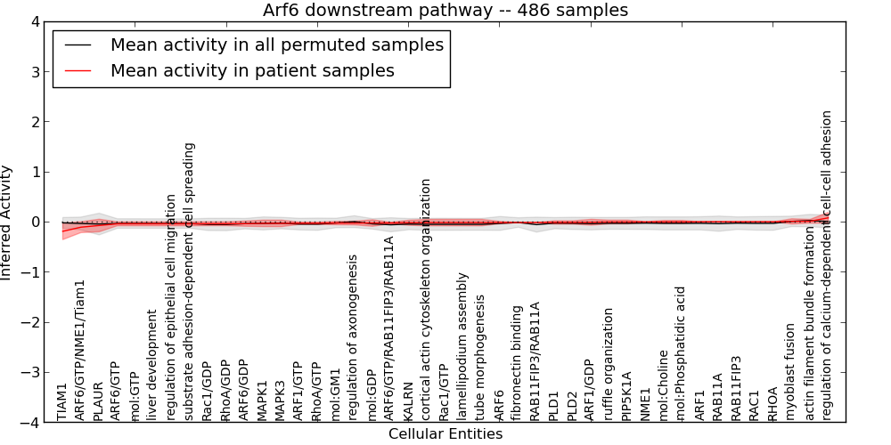 Figure S131. Get High-res Image This plot shows pathway concept perturbations across all samples against a permutation model. The concepts along the x-axis are sorted by lowest to highest mean activity for the real patient samples. Mean inferred activities are plotted along the y-axis as a colored band showing the average level and one standard deviation range. Real samples are shown in red and permuted samples in black.