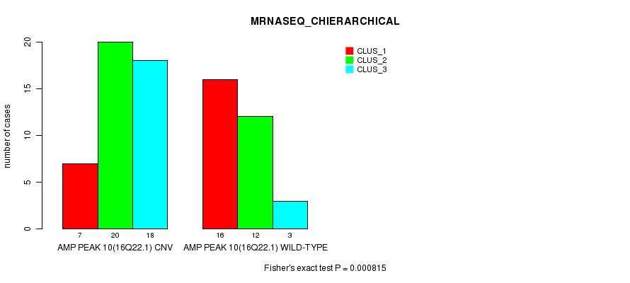 Amp Peak 10(16q22.1) cnvs correlated to 'CN_CNMF' and 'MRNASEQ_CHIERARCHICAL'.