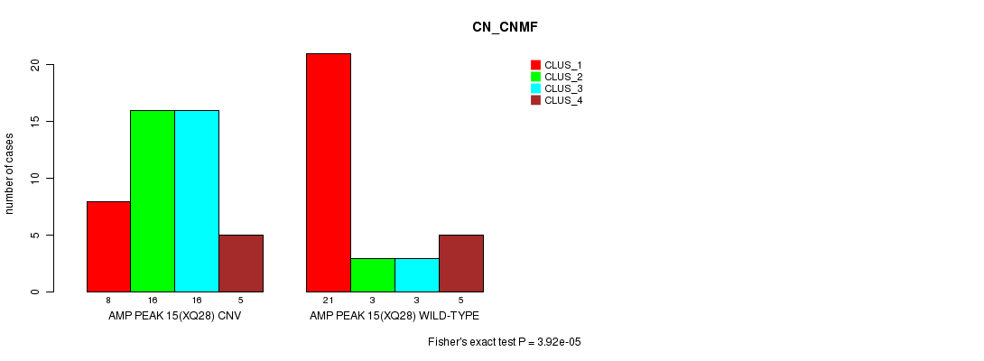 Amp Peak 15(Xq28) cnvs correlated to 'CN_CNMF' and 'MRNASEQ_CNMF'.