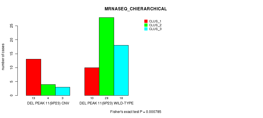 Del Peak 11(9p23) cnvs correlated to 'CN_CNMF', 'MRNASEQ_CNMF', and 'MRNASEQ_CHIERARCHICAL'.