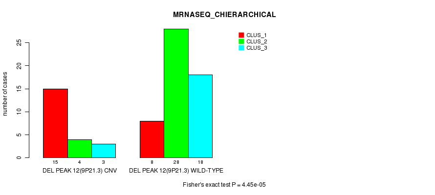 Del Peak 12(9p21.3) cnvs correlated to 'MRNASEQ_CNMF' and 'MRNASEQ_CHIERARCHICAL'.