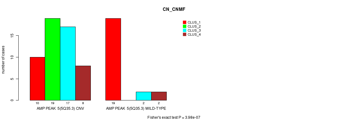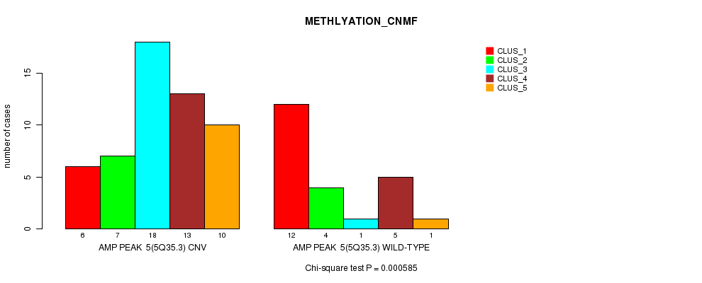 Amp Peak 5(5q35.3) cnvs correlated to 'CN_CNMF', 'METHLYATION_CNMF', 'MRNASEQ_CNMF', and 'MRNASEQ_CHIERARCHICAL'.