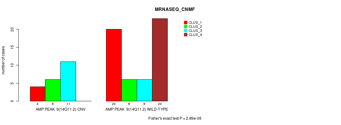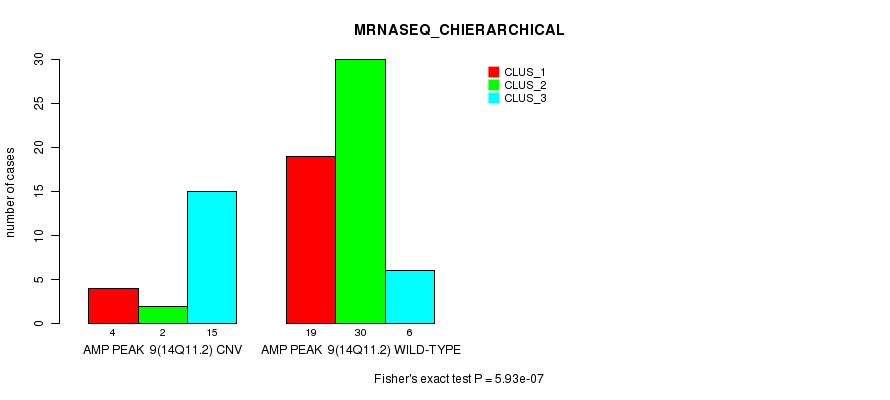 Amp Peak 9(14q11.2) cnvs correlated to 'CN_CNMF', 'MRNASEQ_CNMF', and 'MRNASEQ_CHIERARCHICAL'.