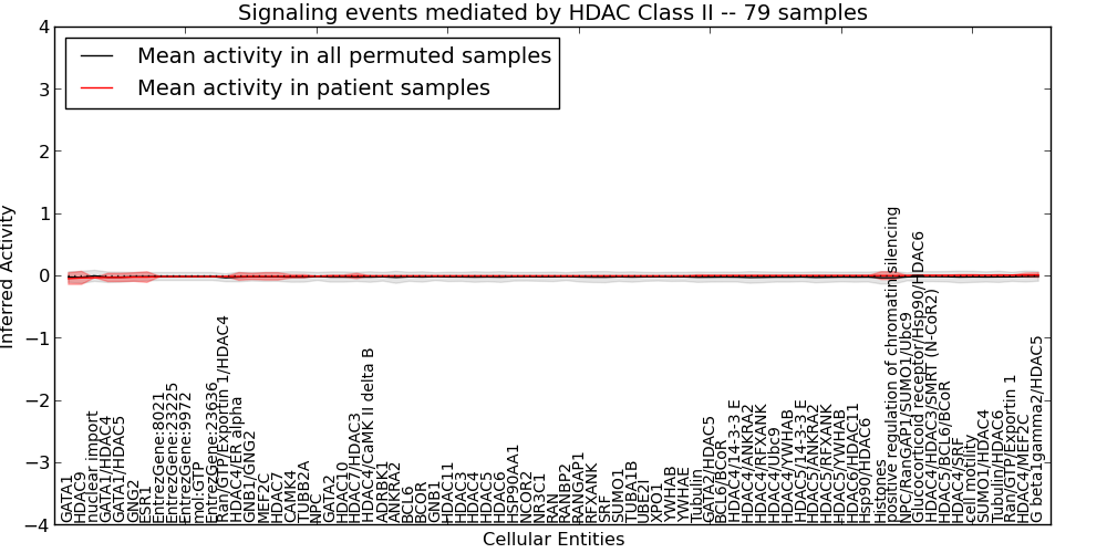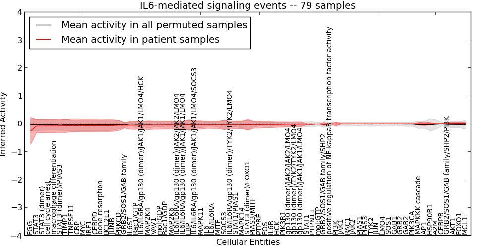 Figure S131. Get High-res Image This plot shows pathway concept perturbations across all samples against a permutation model. The concepts along the x-axis are sorted by lowest to highest mean activity for the real patient samples. Mean inferred activities are plotted along the y-axis as a colored band showing the average level and one standard deviation range. Real samples are shown in red and permuted samples in black.