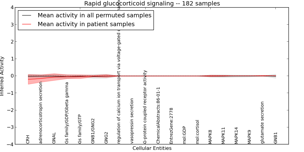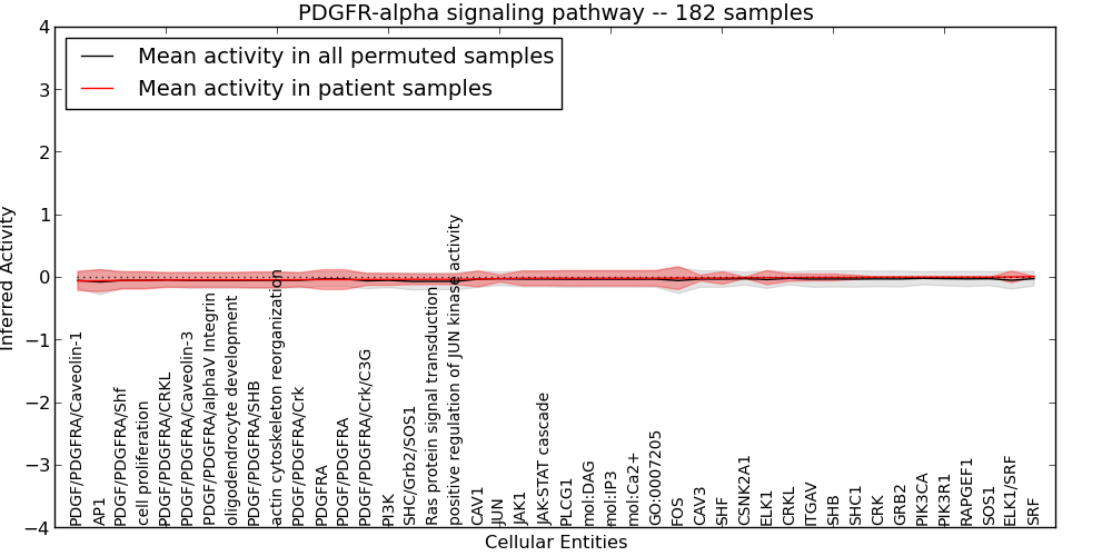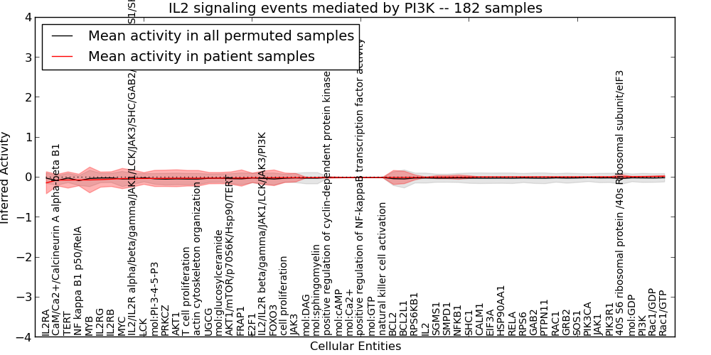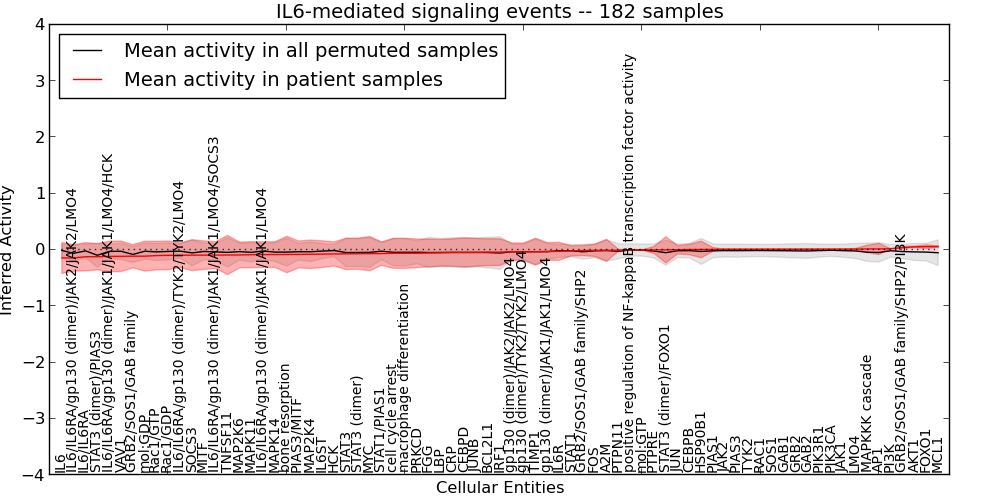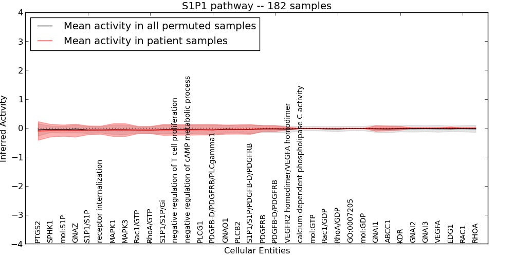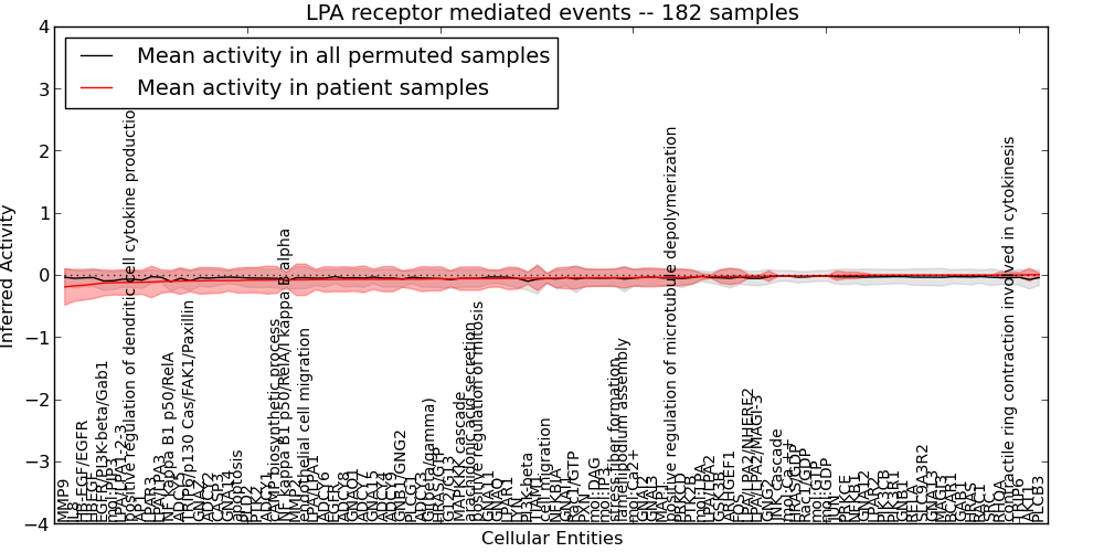 Figure S131. Get High-res Image This plot shows pathway concept perturbations across all samples against a permutation model. The concepts along the x-axis are sorted by lowest to highest mean activity for the real patient samples. Mean inferred activities are plotted along the y-axis as a colored band showing the average level and one standard deviation range. Real samples are shown in red and permuted samples in black.