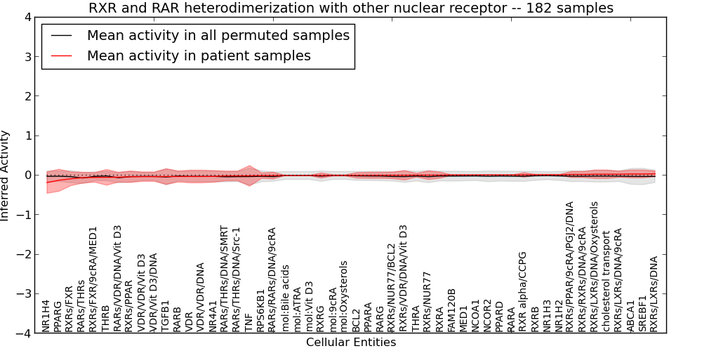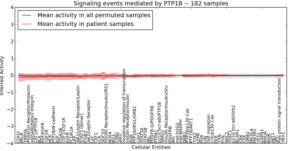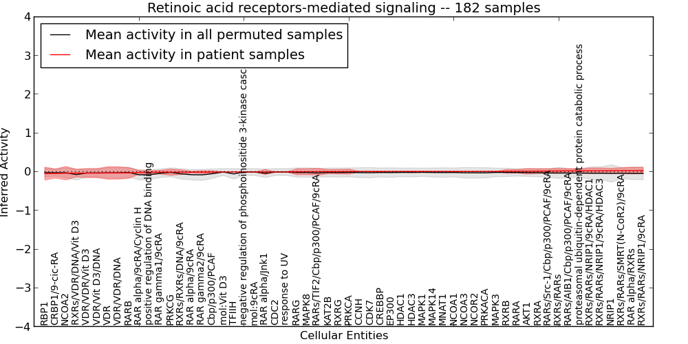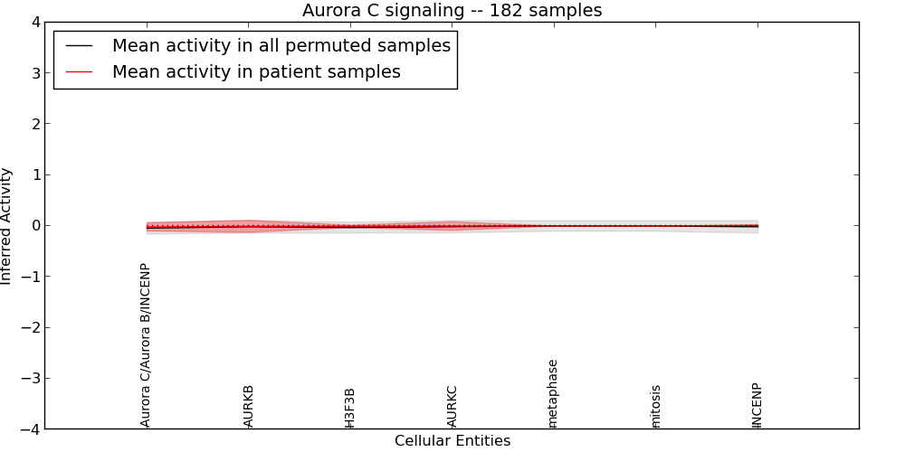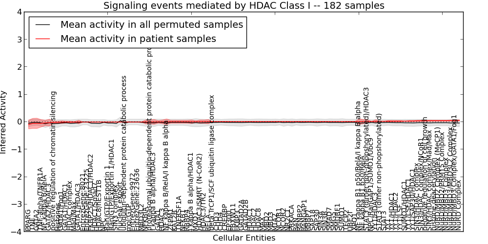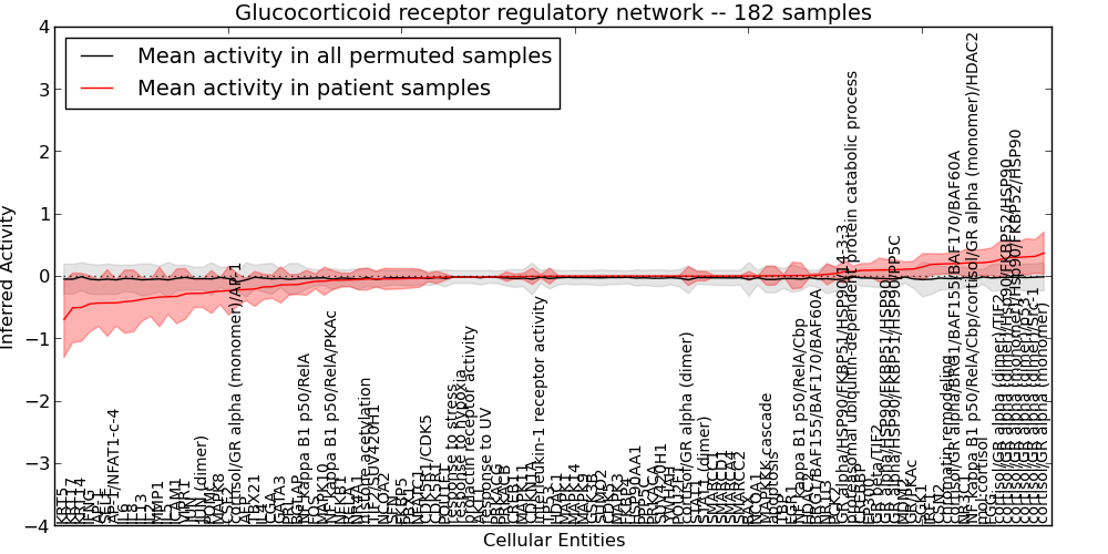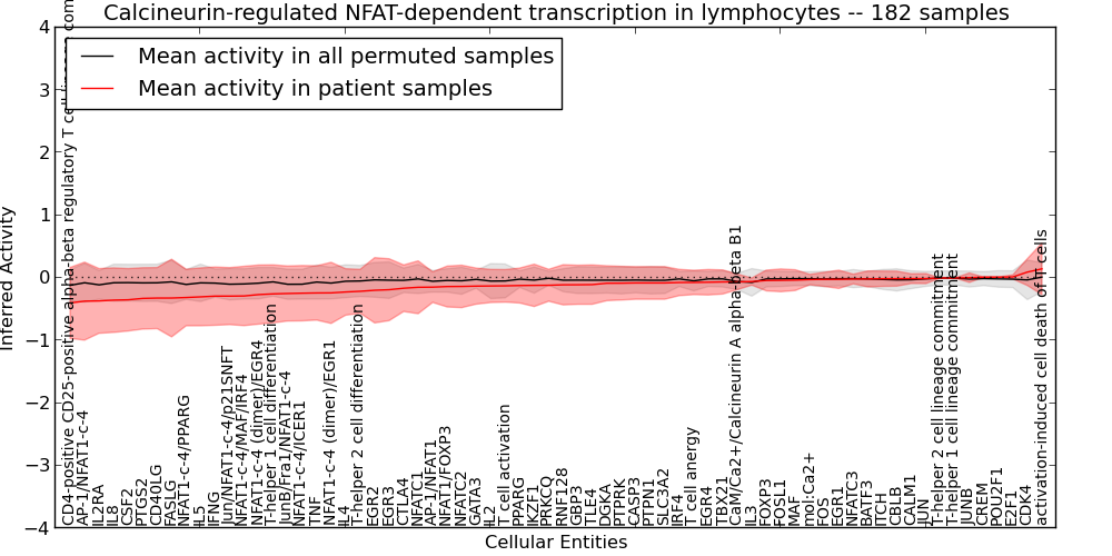 Figure S131. Get High-res Image This plot shows pathway concept perturbations across all samples against a permutation model. The concepts along the x-axis are sorted by lowest to highest mean activity for the real patient samples. Mean inferred activities are plotted along the y-axis as a colored band showing the average level and one standard deviation range. Real samples are shown in red and permuted samples in black.