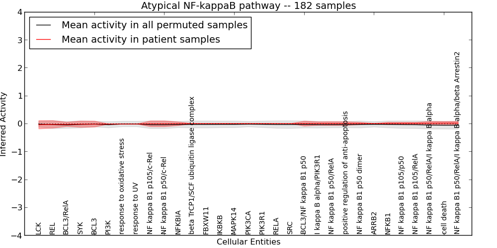 Figure S129. Get High-res Image This plot shows pathway concept perturbations across all samples against a permutation model. The concepts along the x-axis are sorted by lowest to highest mean activity for the real patient samples. Mean inferred activities are plotted along the y-axis as a colored band showing the average level and one standard deviation range. Real samples are shown in red and permuted samples in black.