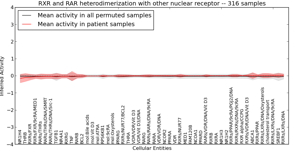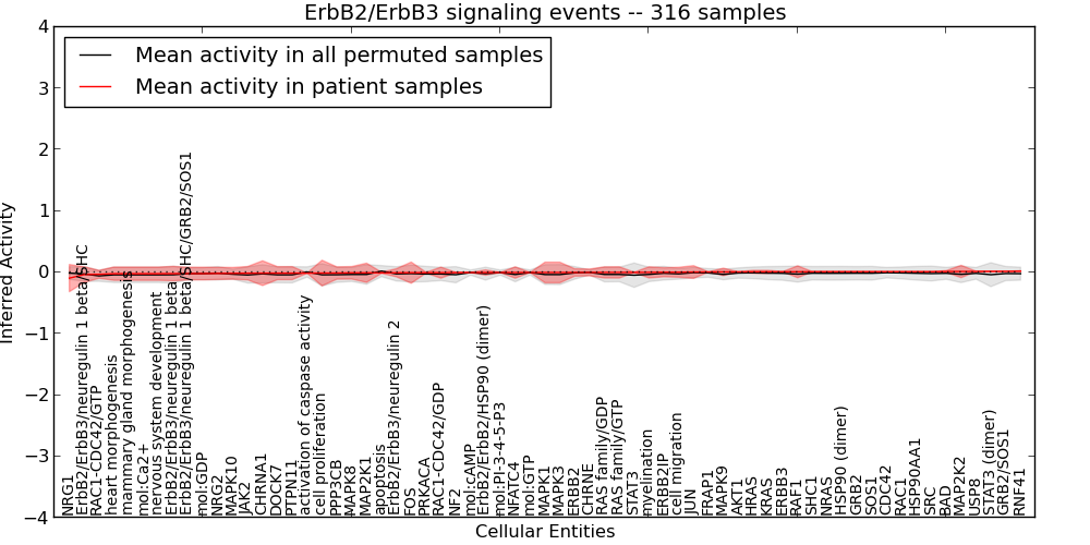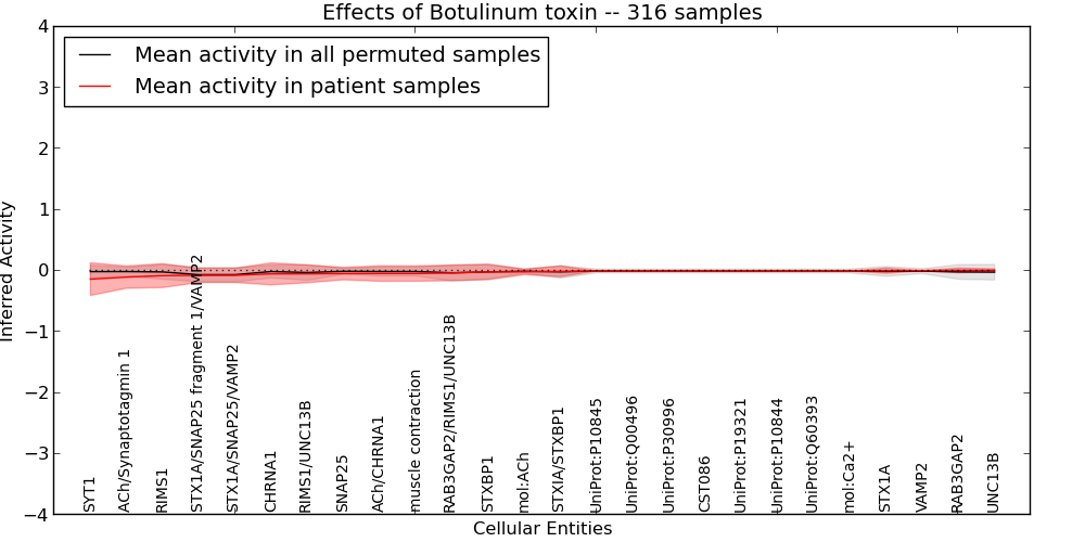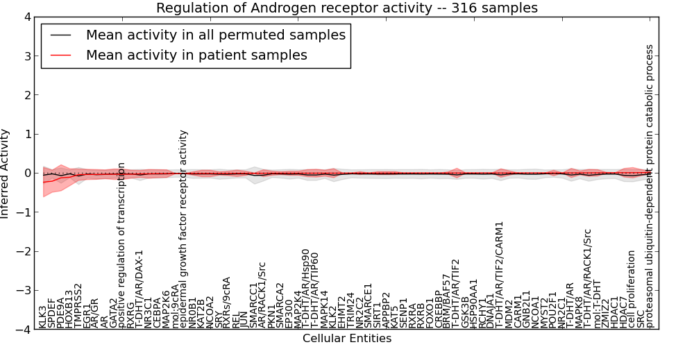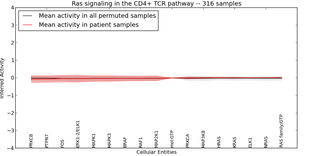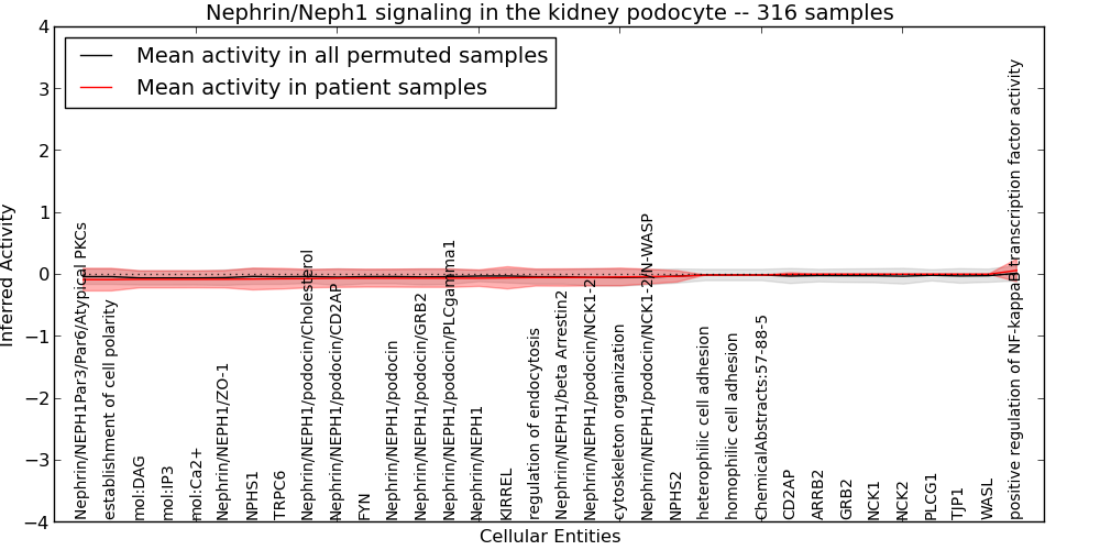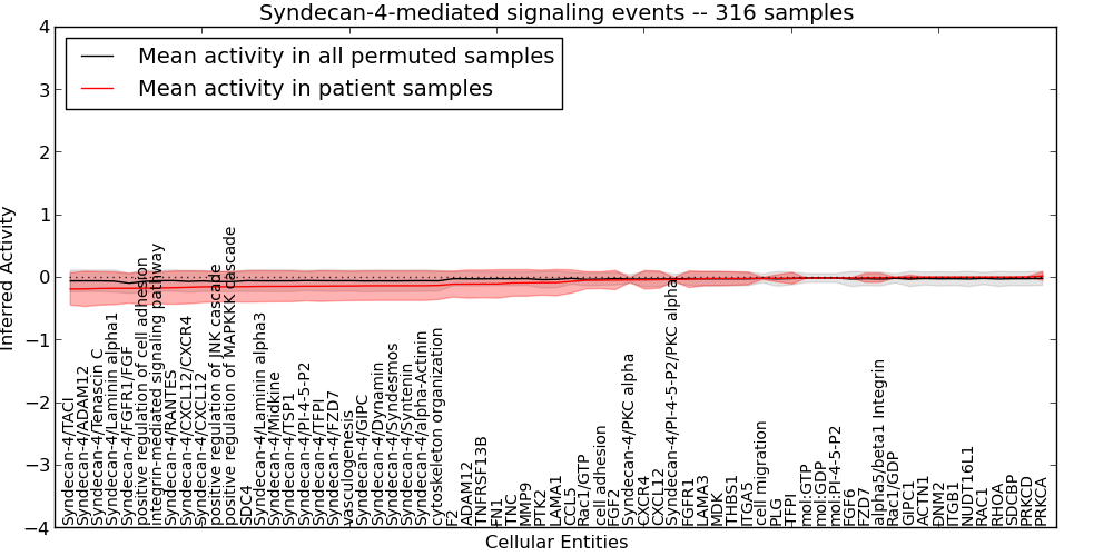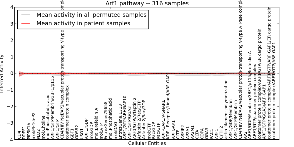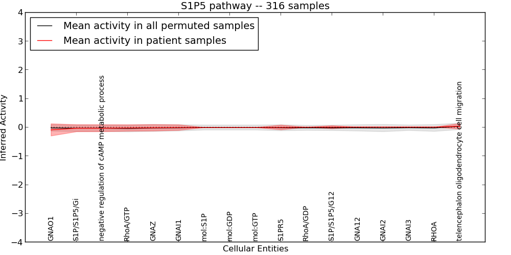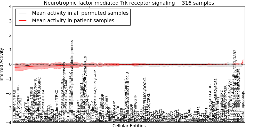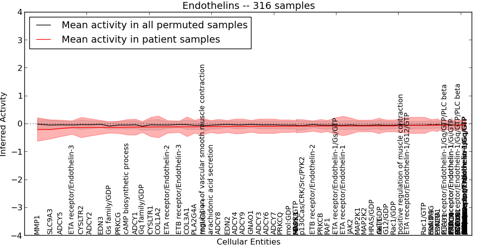 Figure S131.  Get High-res Image This plot shows pathway concept perturbations across all samples against a permutation model. The concepts along the x-axis are sorted by lowest to highest mean activity for the real patient samples. Mean inferred activities are plotted along the y-axis as a colored band showing the average level and one standard deviation range. Real samples are shown in red and permuted samples in black.