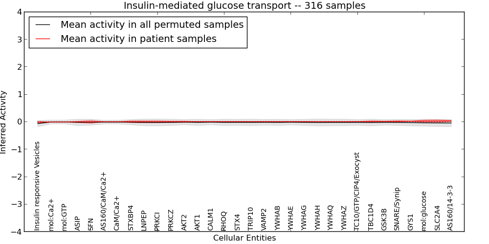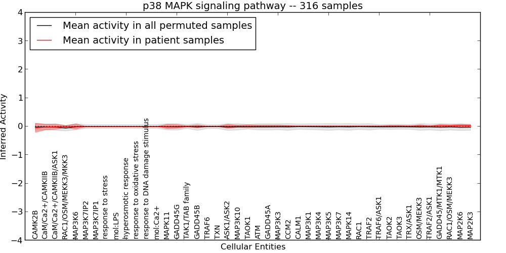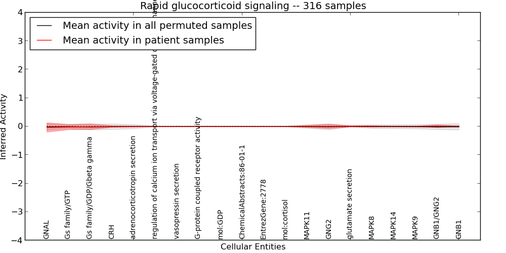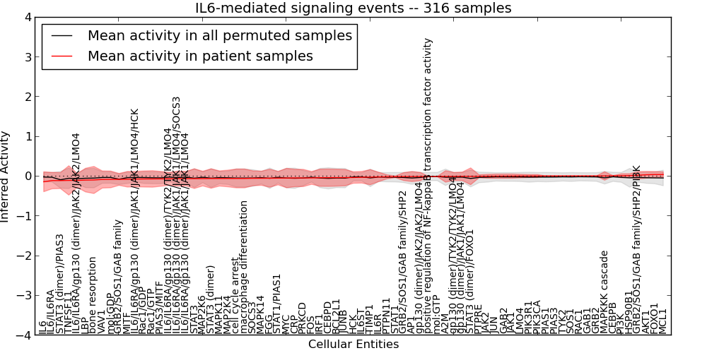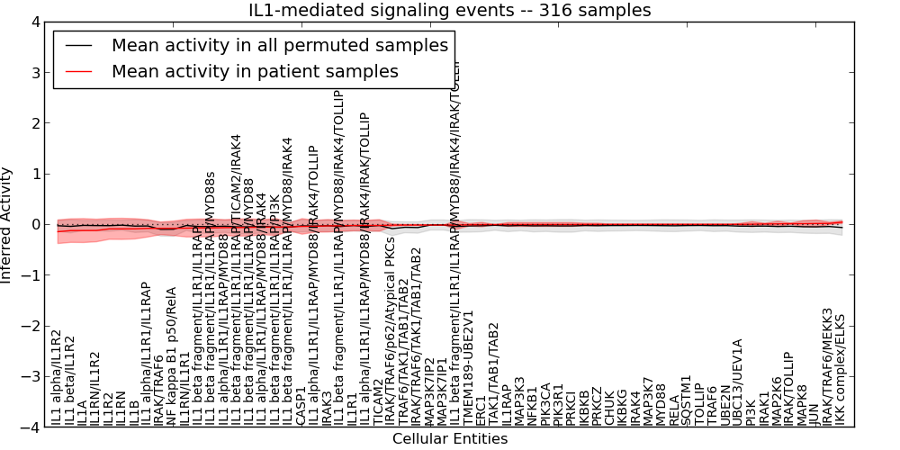 Figure S128.  Get High-res Image This plot shows pathway concept perturbations across all samples against a permutation model. The concepts along the x-axis are sorted by lowest to highest mean activity for the real patient samples. Mean inferred activities are plotted along the y-axis as a colored band showing the average level and one standard deviation range. Real samples are shown in red and permuted samples in black.